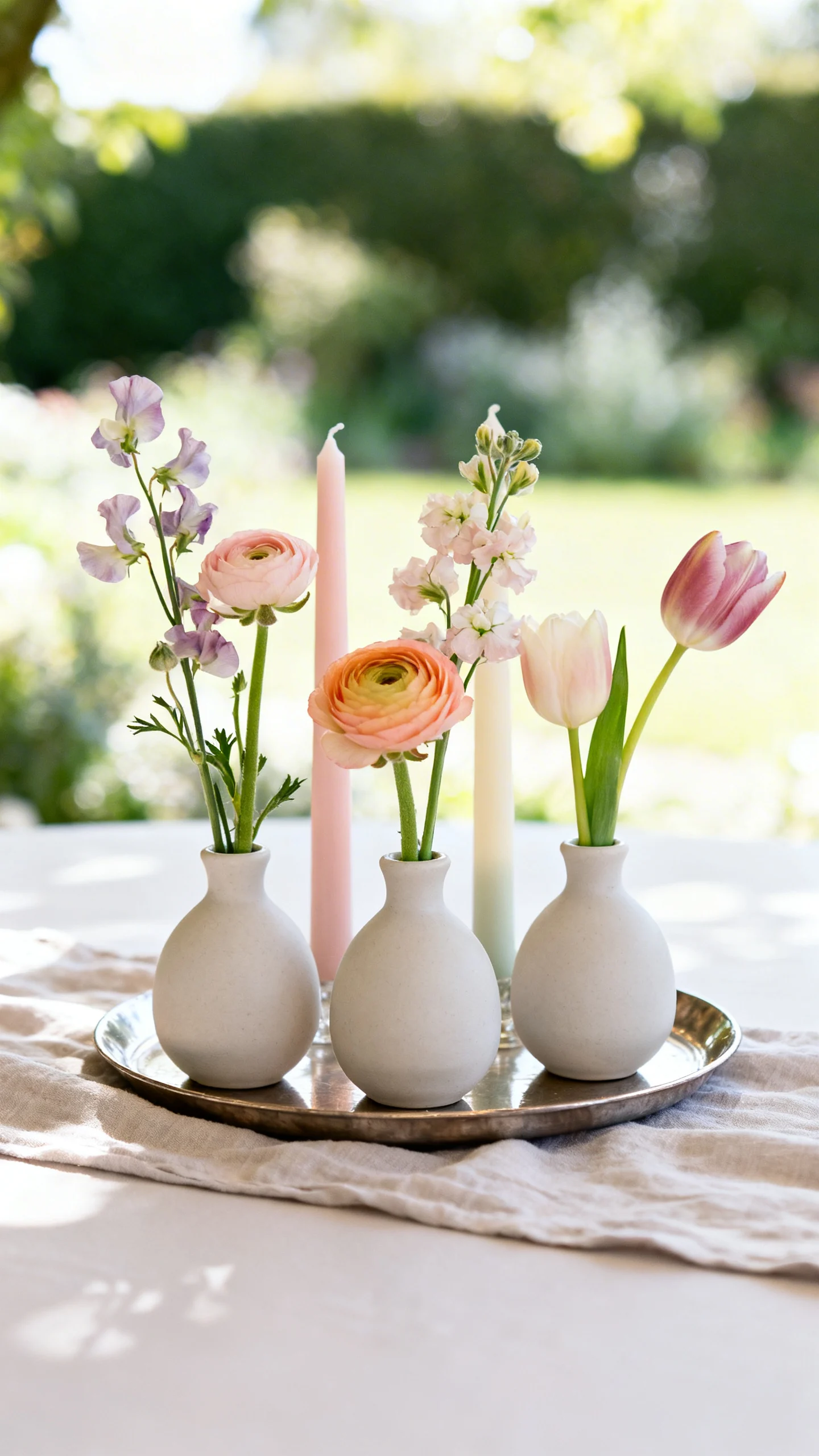 Group three small bud vases with a few spring stems (think ranunculus, sweet peas, or tulips) and tuck in two slim taper candles. Keep the vases low so guests can see over them, and choose tapers in soft blush, ivory, or pale sage. For cohesion, repeat the same vase shape and vary only the flowers. Use a small tray or a linen runner to visually “anchor” the cluster.