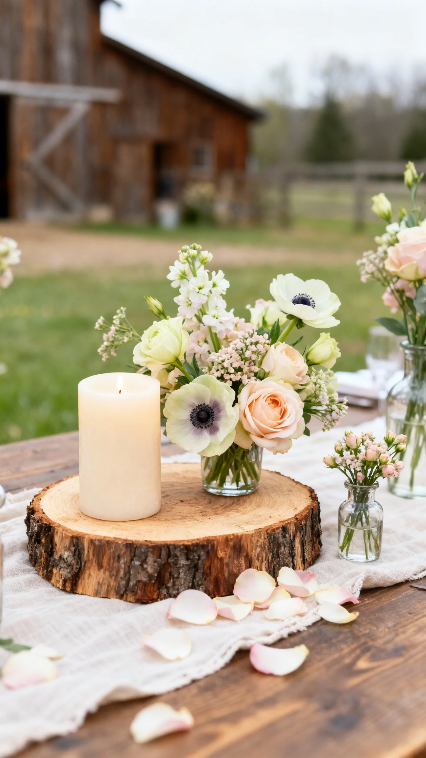 For a romantic rustic look, use a smooth wood slice as a base for one pillar candle and a small floral arrangement. Choose blooms that feel spring-light (anemones, stock, or spray roses) rather than heavy, dark tones. Add a few scattered petals or tiny bud vases nearby to make it feel fuller without adding height. This is easy to batch-assemble and transport, especially for backyard or barn venues.