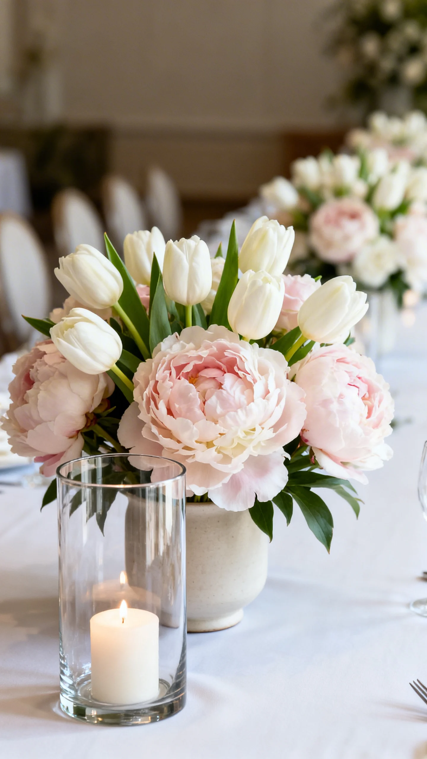 This is the ultimate minimal-but-romantic centerpiece: pair one large spring bloom arrangement with one hurricane candle. Think peonies, garden roses, or a lush tulip bundle in a simple vase, with a glass hurricane beside it. Keep heights intentional—either both low, or one tall and one low—so it feels designed. Repeat the same pairing down the table for an effortlessly polished look.