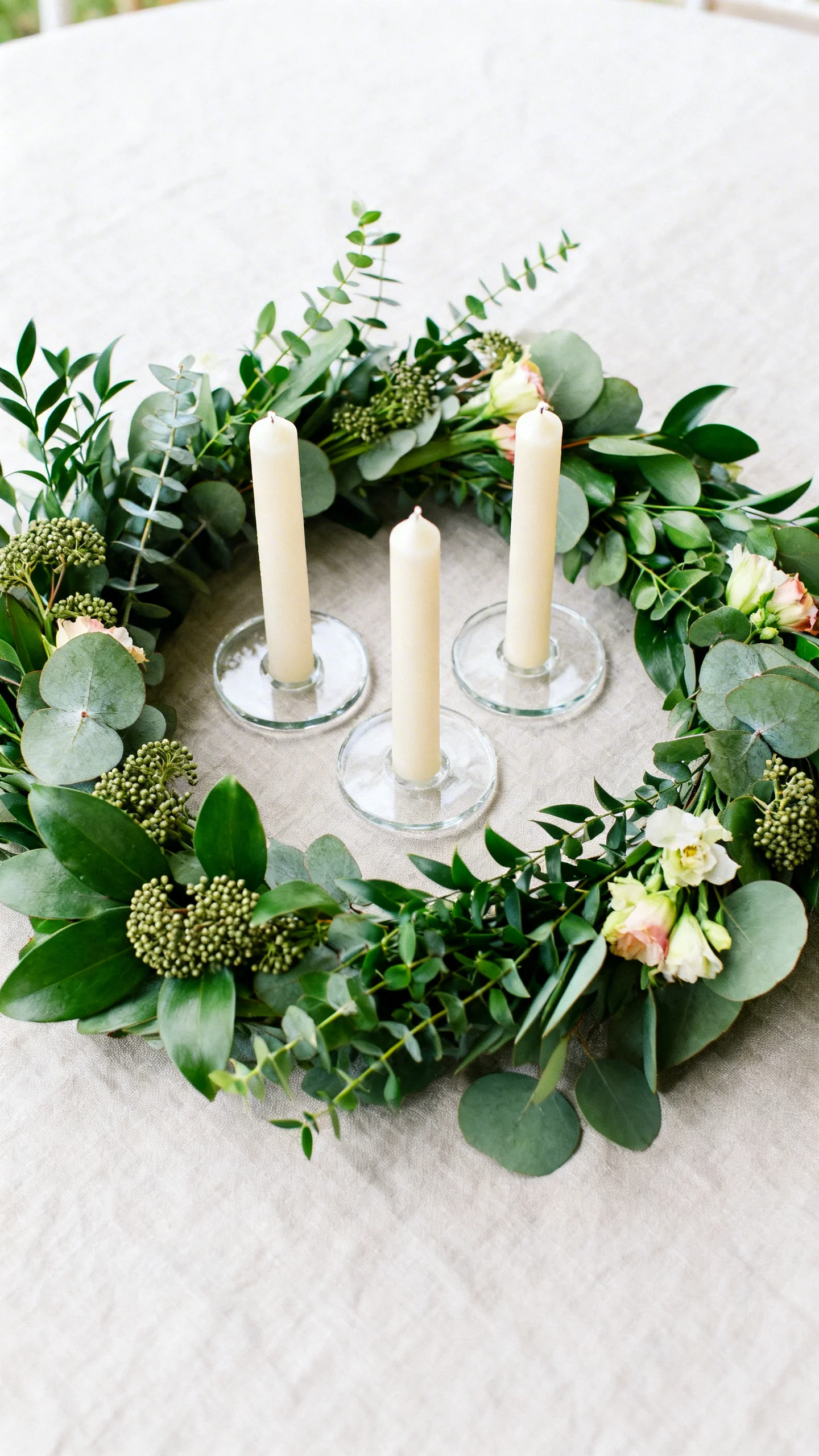 Create a soft “nest” with a loose greenery wreath and place one to three pillar candles in the center. Choose spring-friendly greens like seeded eucalyptus, Italian ruscus, or smilax, and keep the shape imperfect for a garden feel. To protect linens, set candles on clear glass coasters or small plates. Add a few blooms tucked into the greenery for a subtle pop of color.