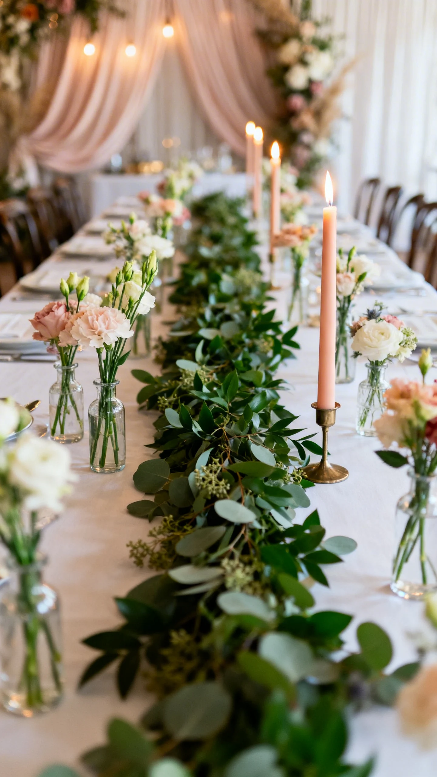 Start with a single greenery garland down the center, then add bud vases at consistent intervals plus taper candles for height and glow. This looks abundant without needing large arrangements, and it stretches your floral budget. Choose one taper color that matches your napkins or stationery for a pulled-together look. Keep flames away from greenery by using taller holders and leaving a little breathing room.