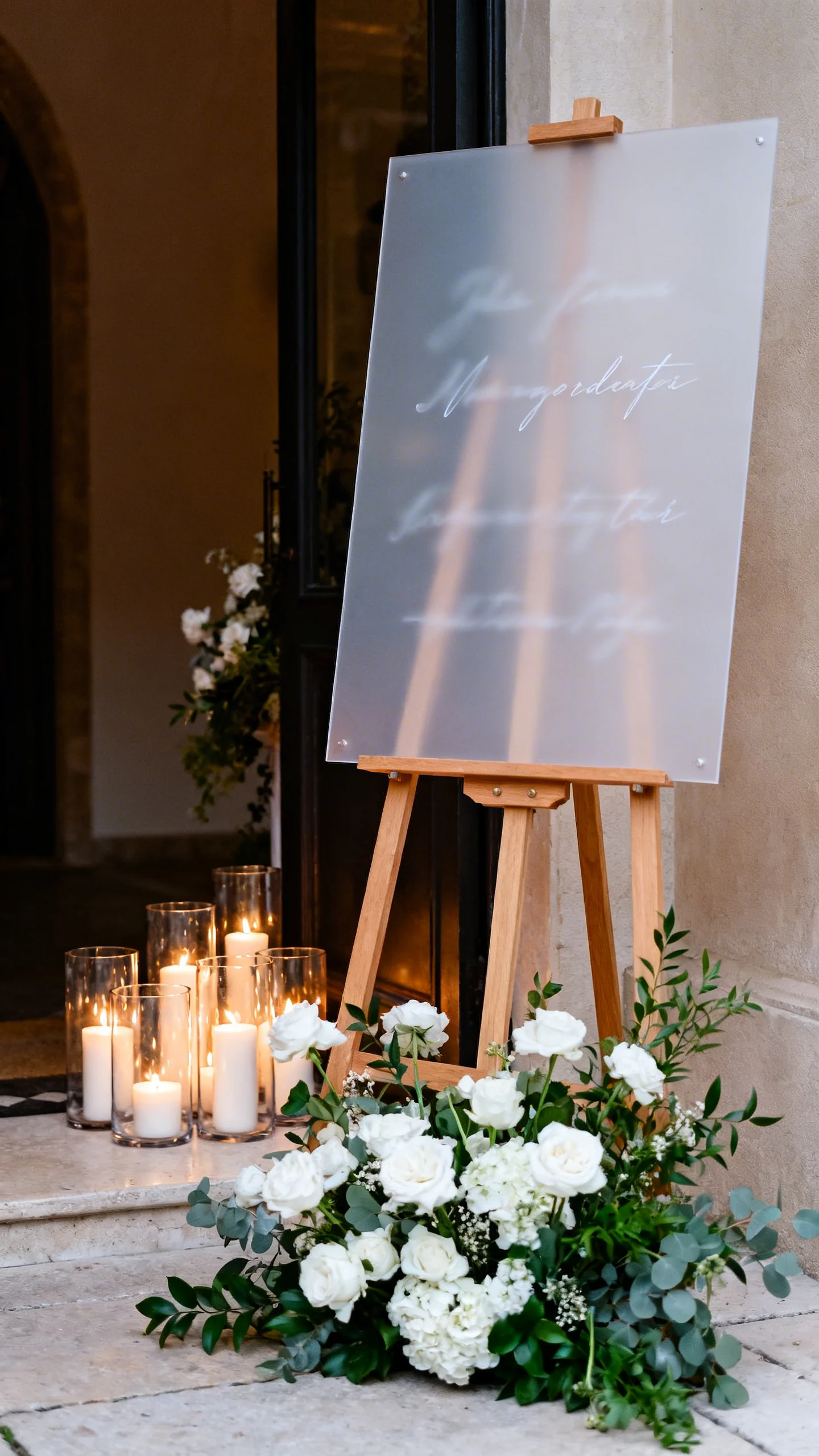 Turn a functional sign into a photo-worthy backdrop by scaling it up and styling the base. Acrylic, fabric, or painted boards photograph beautifully when paired with grounded florals and candles. Keep the font bold and readable so it looks good in full-length shots and close-ups. Position it where guests naturally pause—near the entrance or just outside cocktail hour.