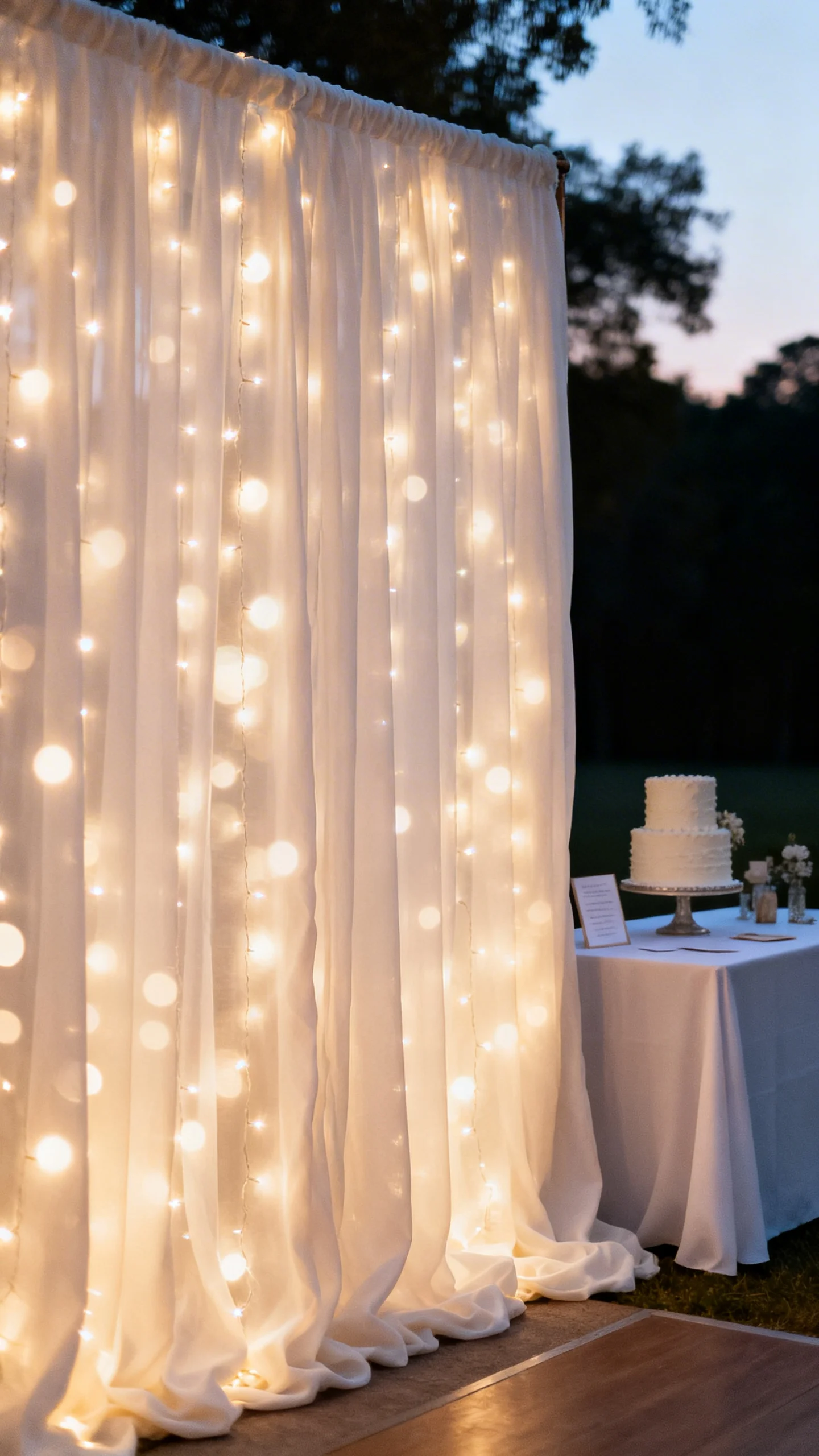String lights behind a sheer curtain create a soft glow that cameras love, especially after sunset. The fabric diffuses the points of light so the background looks dreamy instead of busy. Use warm-white lights and keep the curtain slightly gathered for texture. This backdrop shines for cake cutting, toasts, and cozy evening portraits.