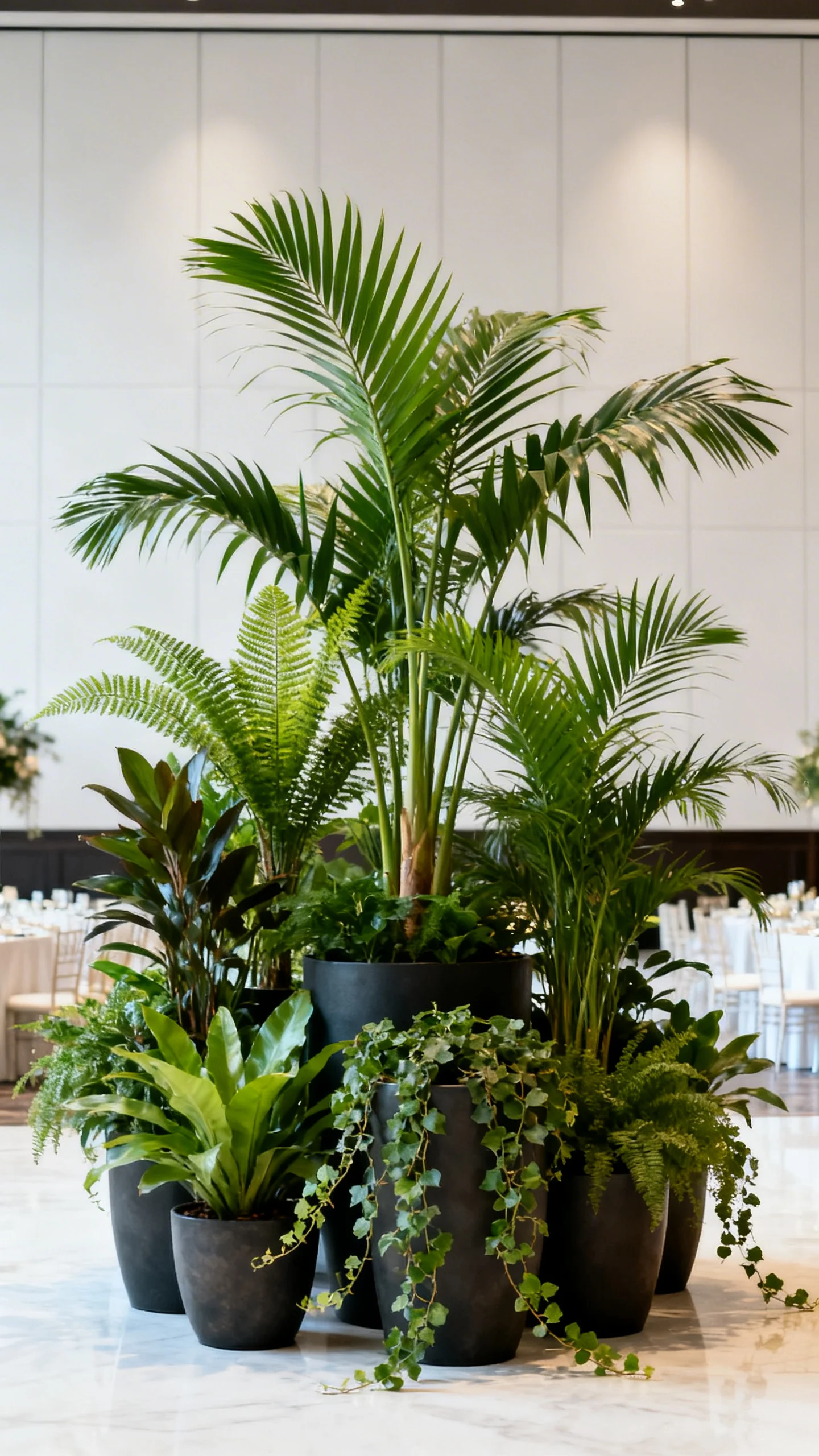 A living wall or clustered potted plants can look fresh, modern, and unexpectedly luxe in photos. Mix leaf shapes and heights—palms, ferns, and trailing vines—to create depth. It’s a great solution for venues that don’t allow nails or heavy installs because it can be freestanding. Add a small neon-style sign or monogram for a personalized focal point.