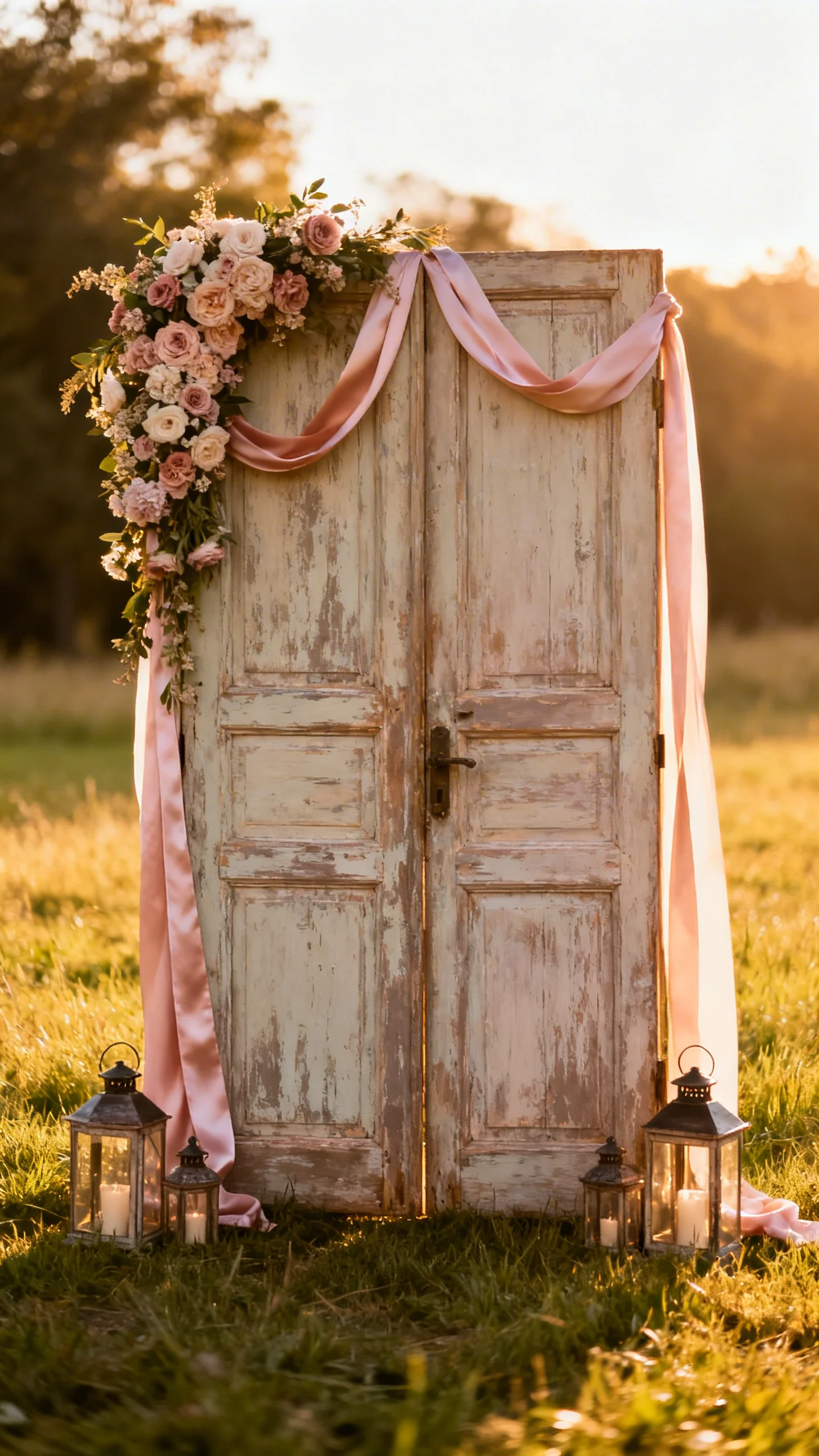 Antique doors or oversized window frames add instant character and texture to portraits. They’re especially stunning in outdoor settings where the contrast makes the backdrop feel curated. Dress them with a floral swag, trailing ribbon, or small lantern clusters for dimension. Anchor everything securely so it stays steady in wind and during group photos.