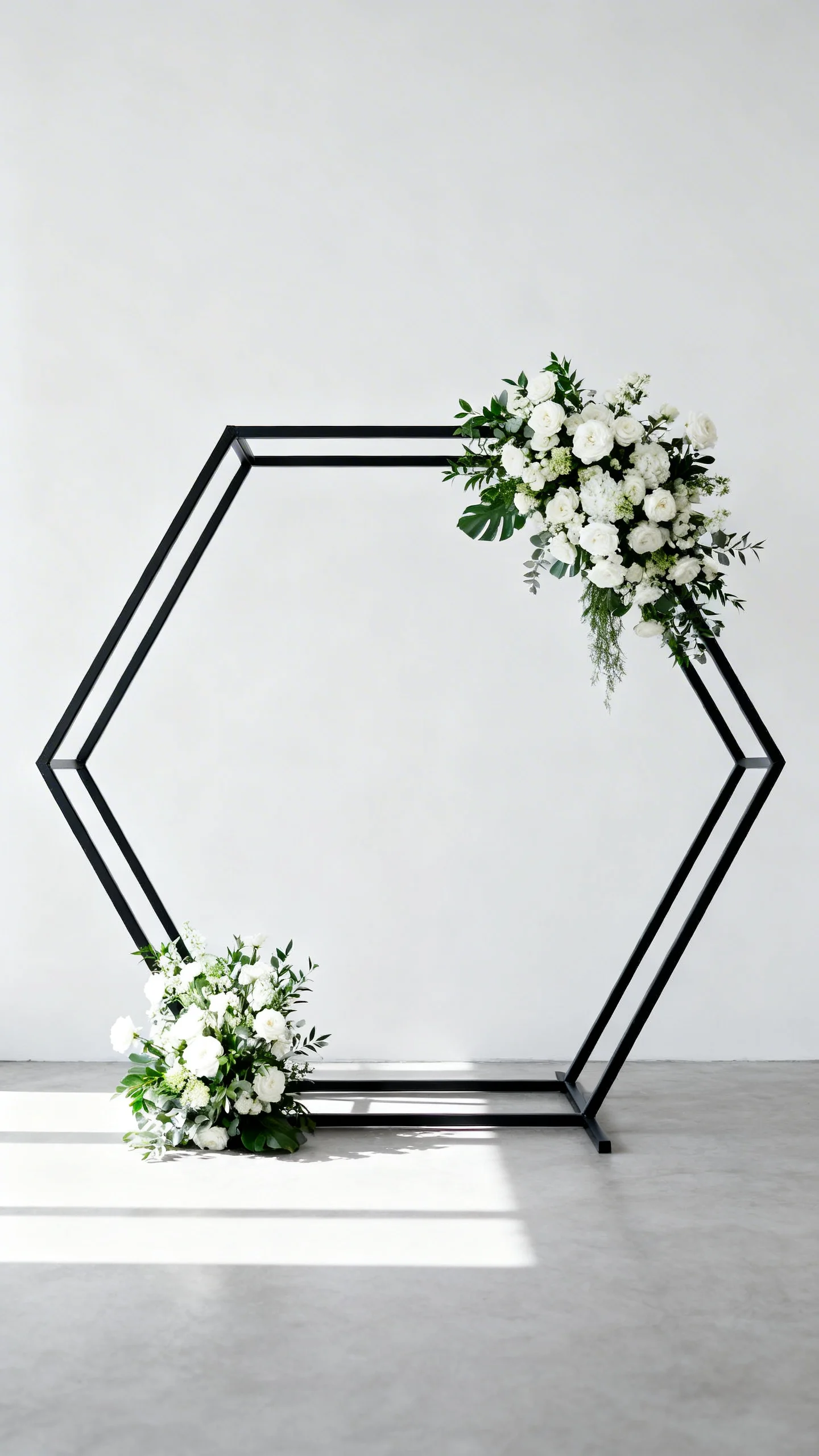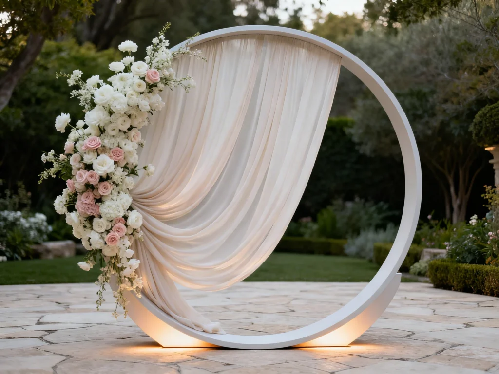 Geometric arches (hexagon, circle, or square) create clean lines that look crisp in wide ceremony shots. Keep florals asymmetrical for a modern, editorial feel that still reads romantic. The negative space helps your faces stand out in photos, especially with minimal décor around it. Match the arch finish to your metals (gold, black, or wood) for a cohesive look.
