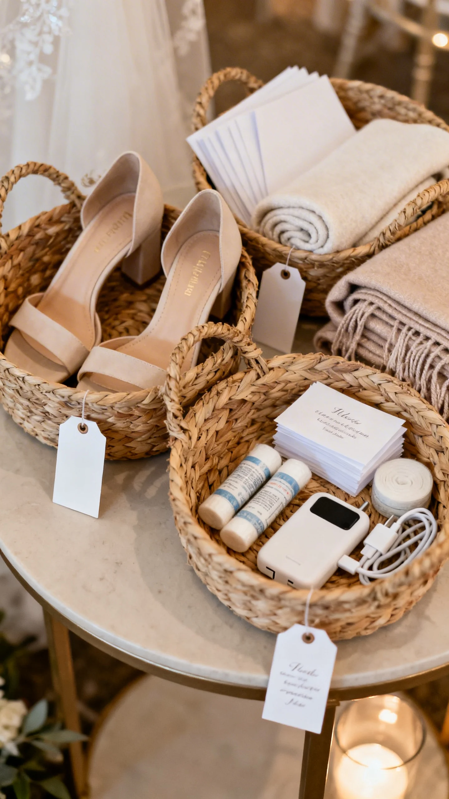 Include practical, guest-friendly items: blister bandages, heel protectors, blotting papers, hair ties, mints, stain remover wipes, and phone charging options. Keep it neat with baskets and a small sign so it looks like part of your wedding design.