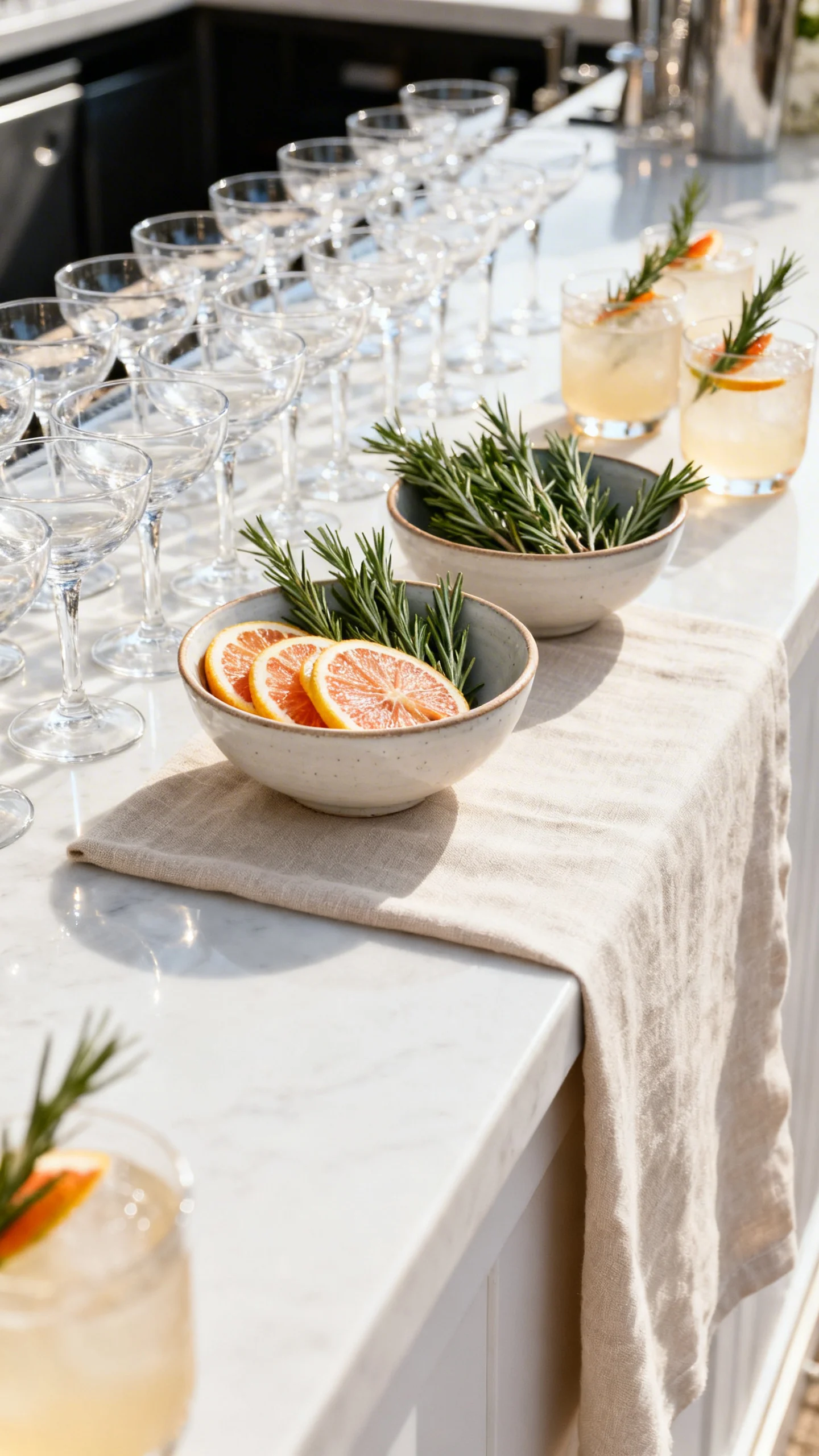 A cohesive garnish instantly makes drinks feel intentional without adding a full specialty cocktail menu. Choose one or two options that match your palette—citrus wheels, rosemary, edible flowers, or dehydrated fruit. Ask the bar team to use the same glassware style for signature drinks for a polished look. It’s a simple aesthetic win that shows up in every candid photo.