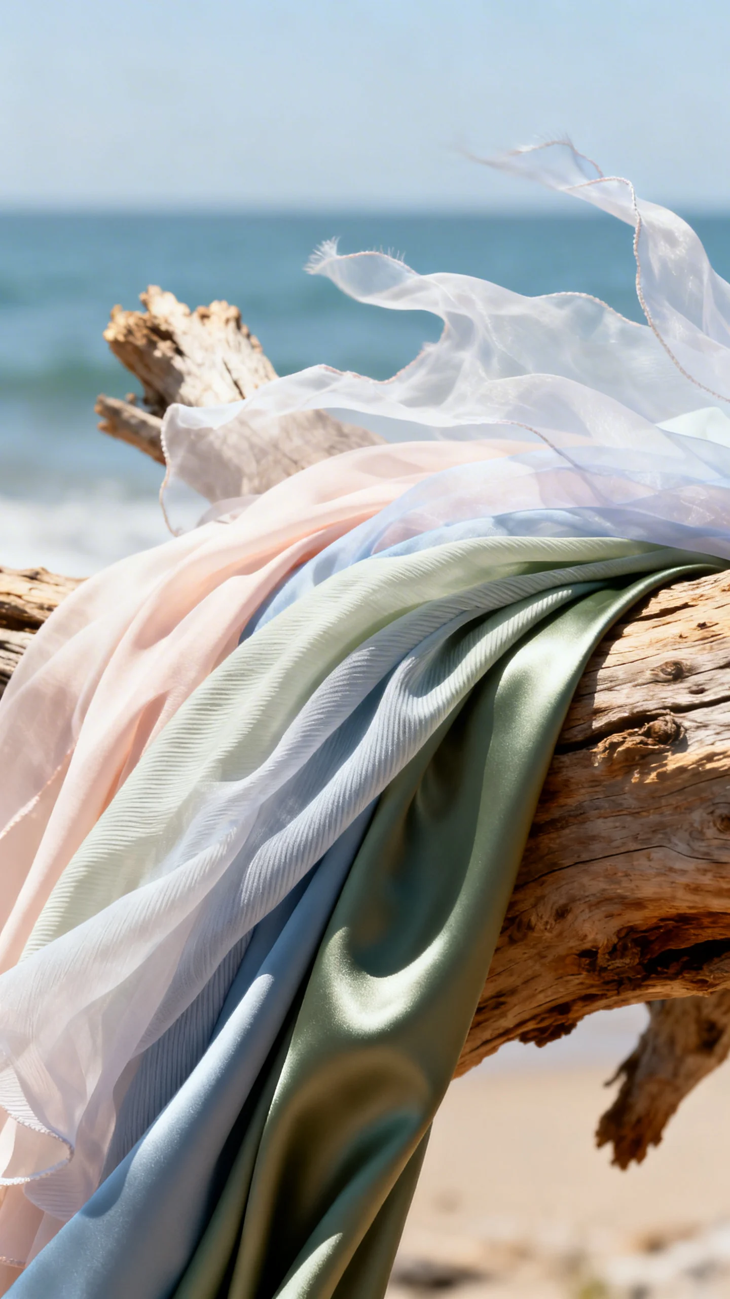 Soft neutrals, sea-glass tones, sunset shades, and warm pastels match the coastal setting without competing with it. If you’re worried about transparency in bright sun, choose slightly deeper versions of pale hues (like sand instead of ivory, or blush instead of very light pink). For a more formal aesthetic, navy, terracotta, or sage read rich while still beach-appropriate. Think “sunlit and sophisticated,” not overly stark.