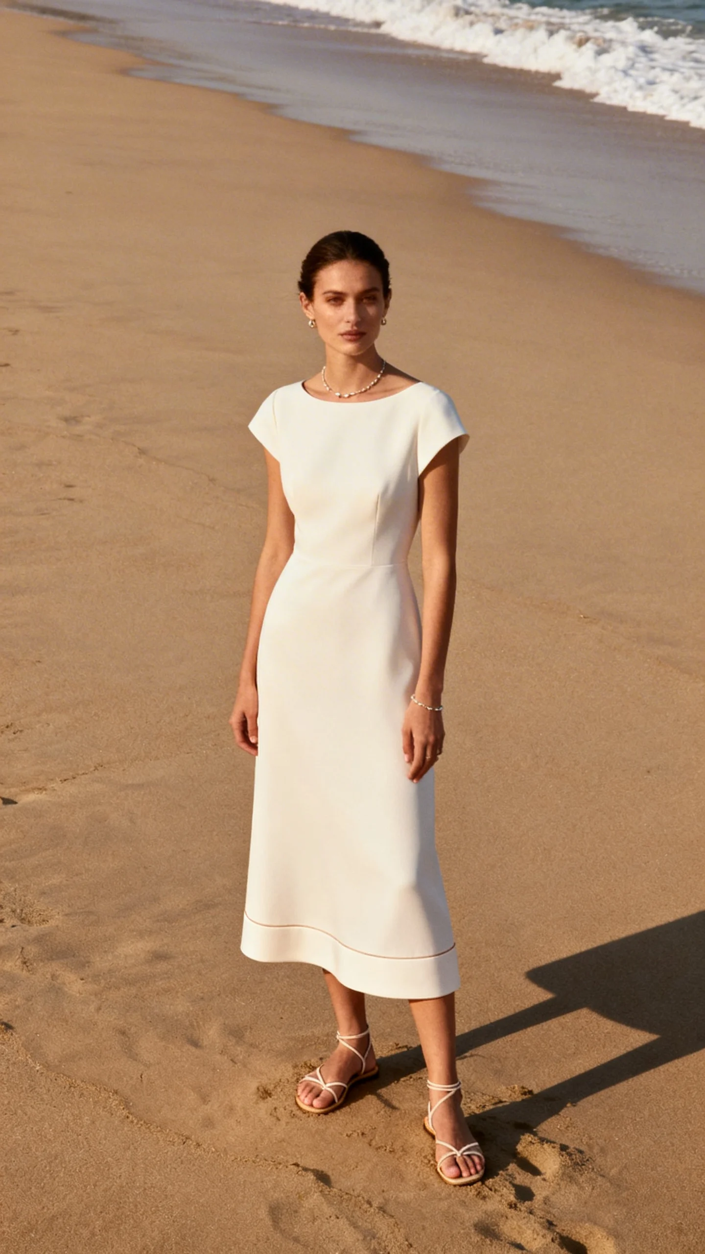 Midi dresses are a sweet spot for beach ceremonies: elevated, easy to walk in, and less likely to whip around. They also show off shoes (or barefoot jewelry) and look modern in photos. If you’re a bridesmaid, midi lengths help keep the group looking coordinated without everyone fussing with long hems. Bonus: they’re practical for sand-to-dance-floor transitions.