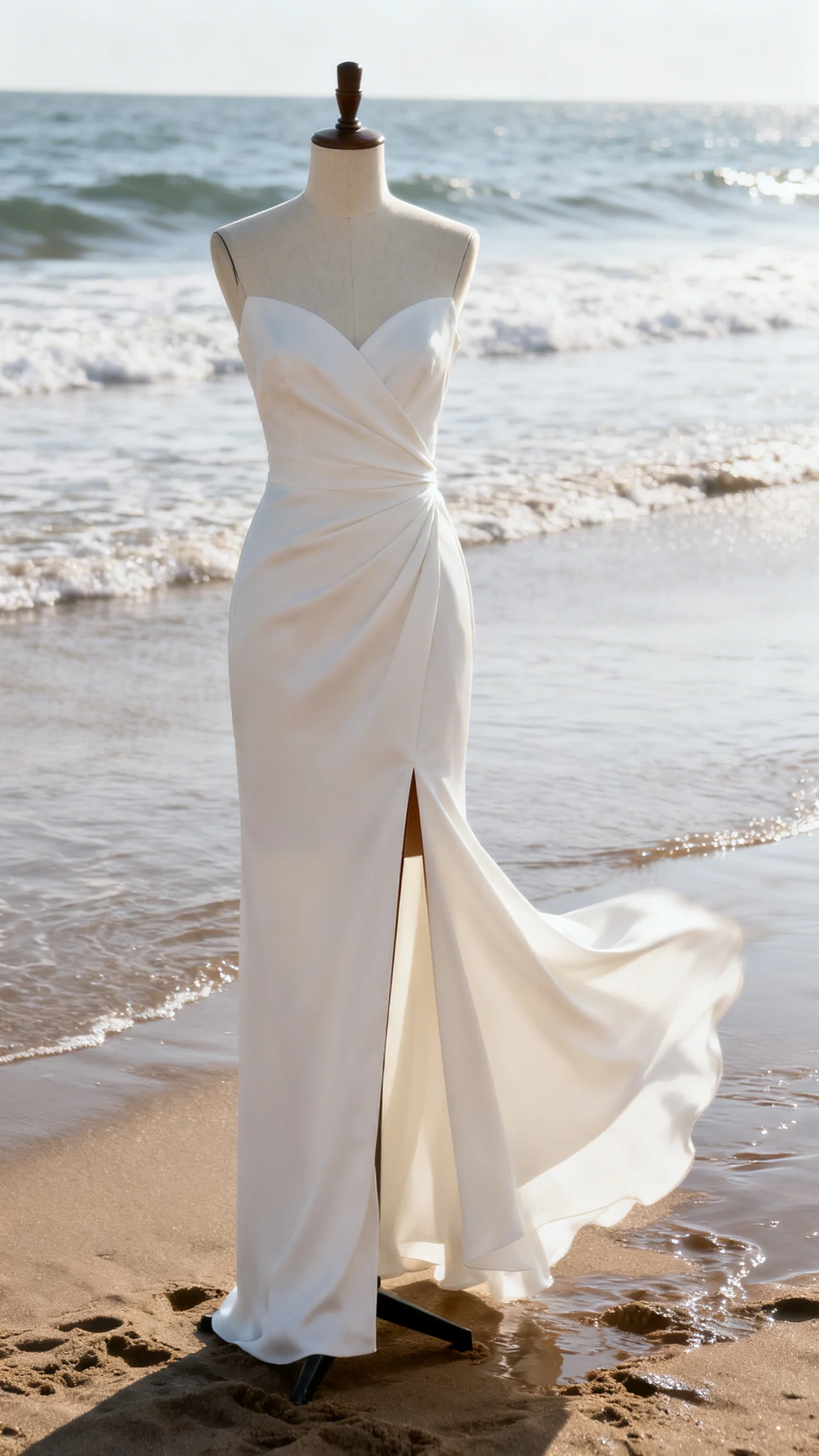 A tasteful slit is both elegant and practical on sand, giving your legs room to move without stepping on your skirt. Keep the slit placed to the side or slightly off-center for a refined look. If you’re in a bridal party, match slit height guidelines so everyone feels comfortable and cohesive. In wind, a moderate slit also prevents the dress from wrapping around your ankles.
