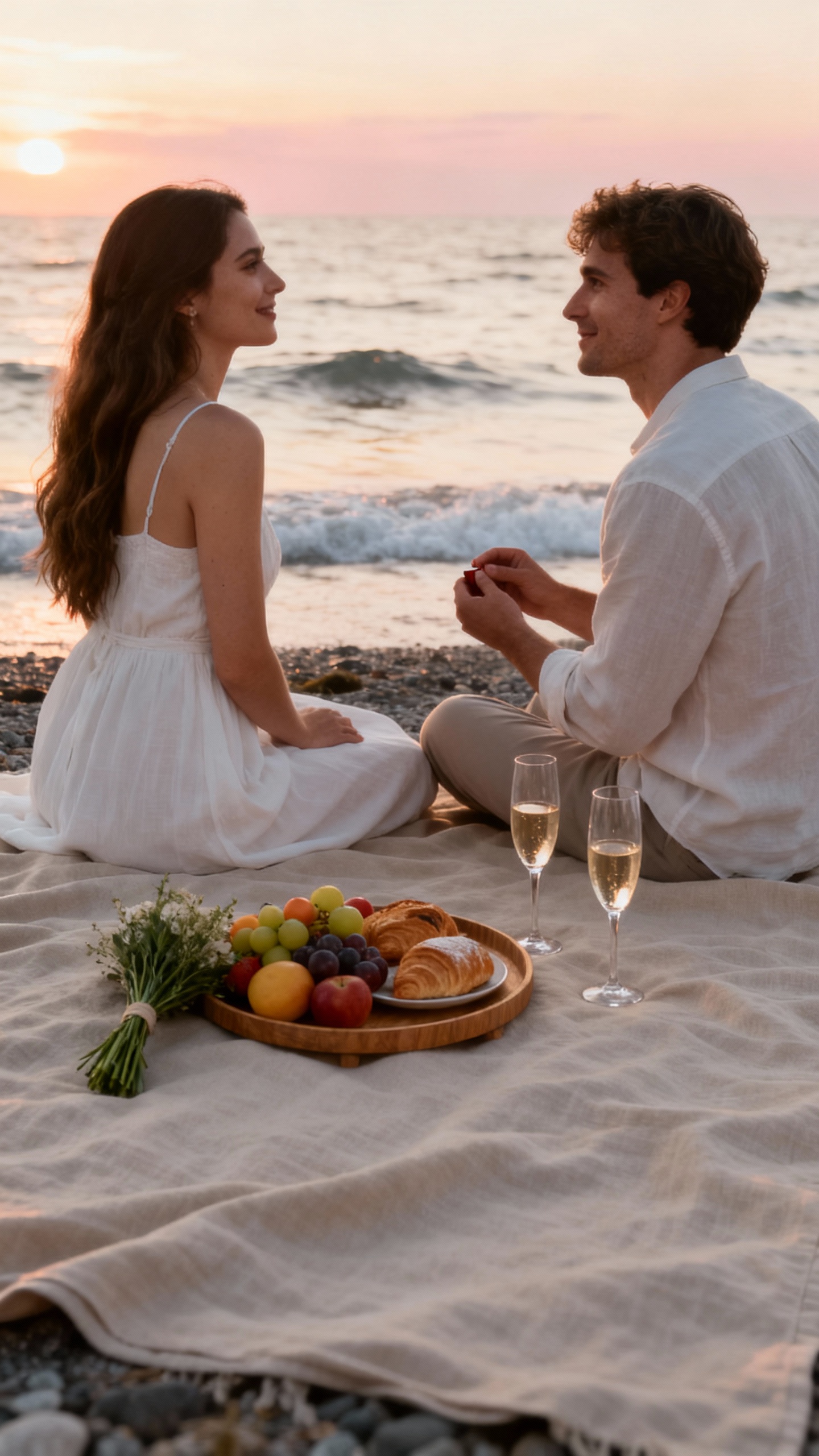 A golden-hour picnic with a neutral setup (blanket, small bouquet, and a curated snack board) looks high-end in photos and costs very little.