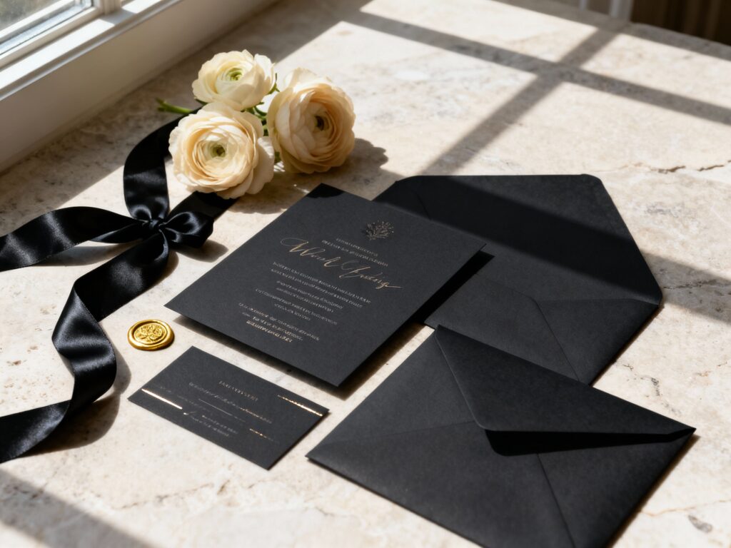 Black wedding invitations are the definition of “quiet luxury” when they’re done with the right details. The trick is making them feel rich and intentional—not flat, crafty, or hard to read.