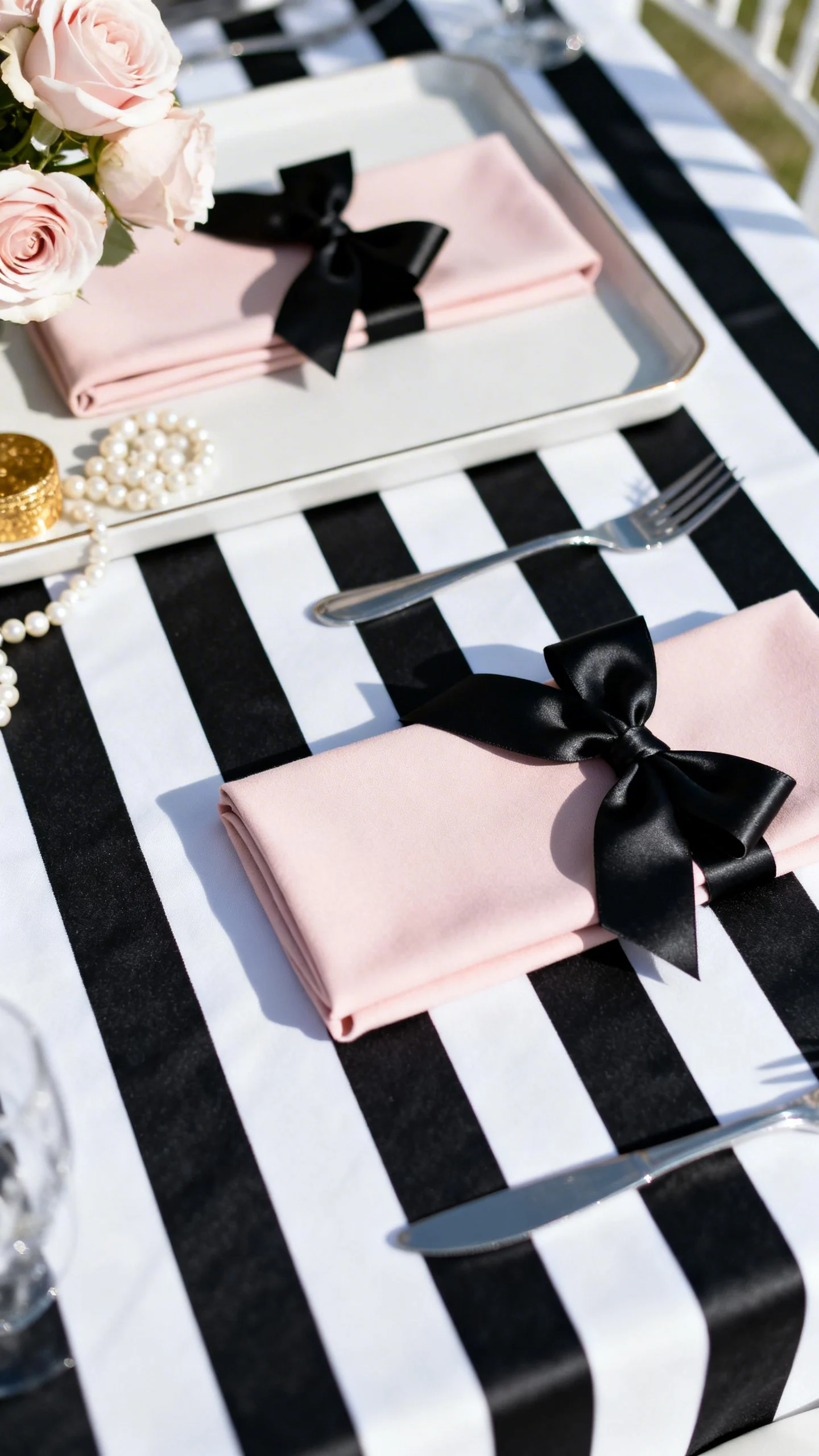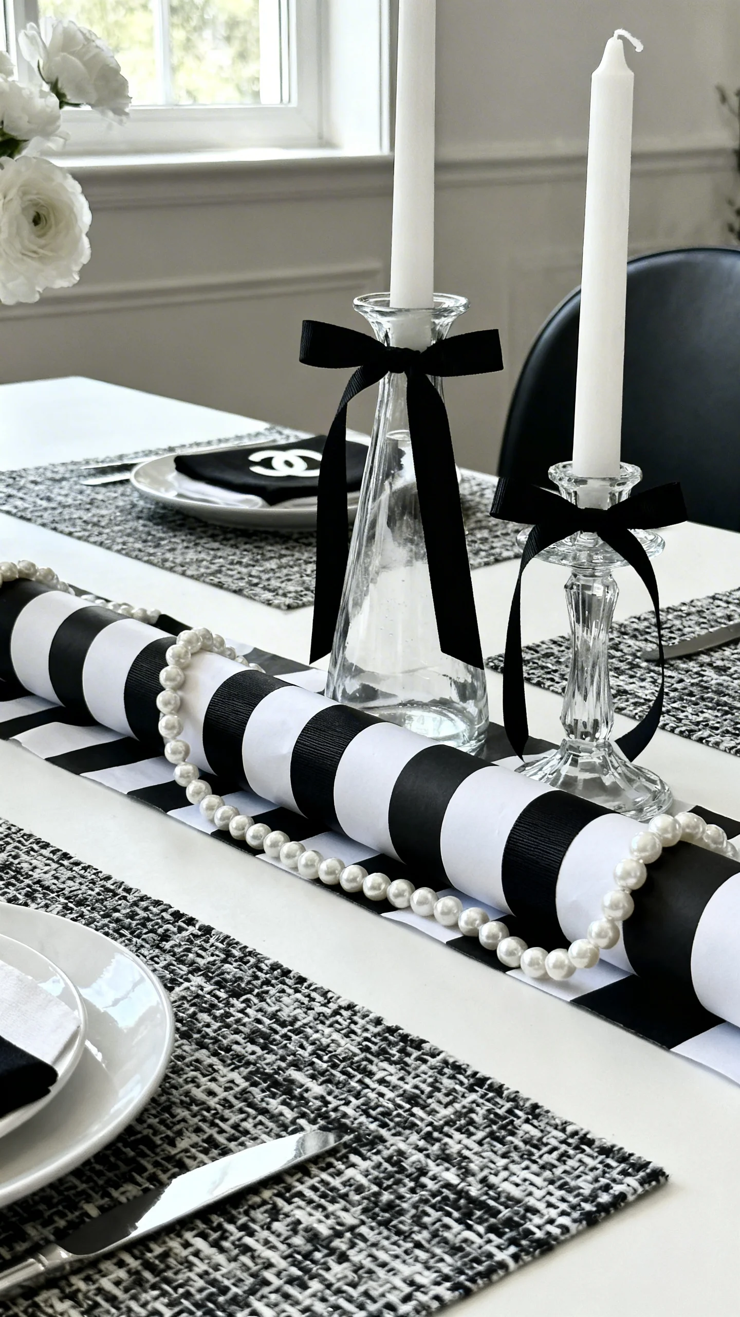 You don’t need pricey fabrics to nod to that iconic look. Use striped wrapping paper as a table runner, tweed-like scrapbook paper as placemats, or black ribbon to tie around chairs and vases. Add a few pearl strands (even faux) to drape along trays or wrap around candleholders. Small texture moments read “designer” in photos.
