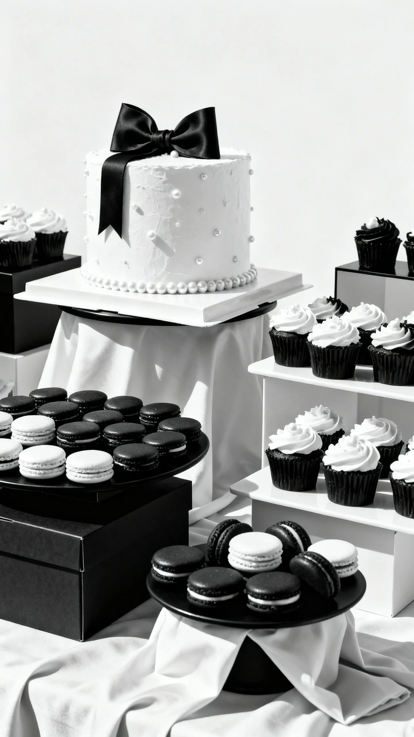 Choose one hero dessert, then keep the rest simple and uniform. A white frosted cake with a black bow or edible pearls looks couture without needing complex decorations. Fill in with monochrome cupcakes, macarons, or store-bought cookies arranged in neat rows. Elevate everything by using different heights with boxes under linens or overturned bowls under platters.