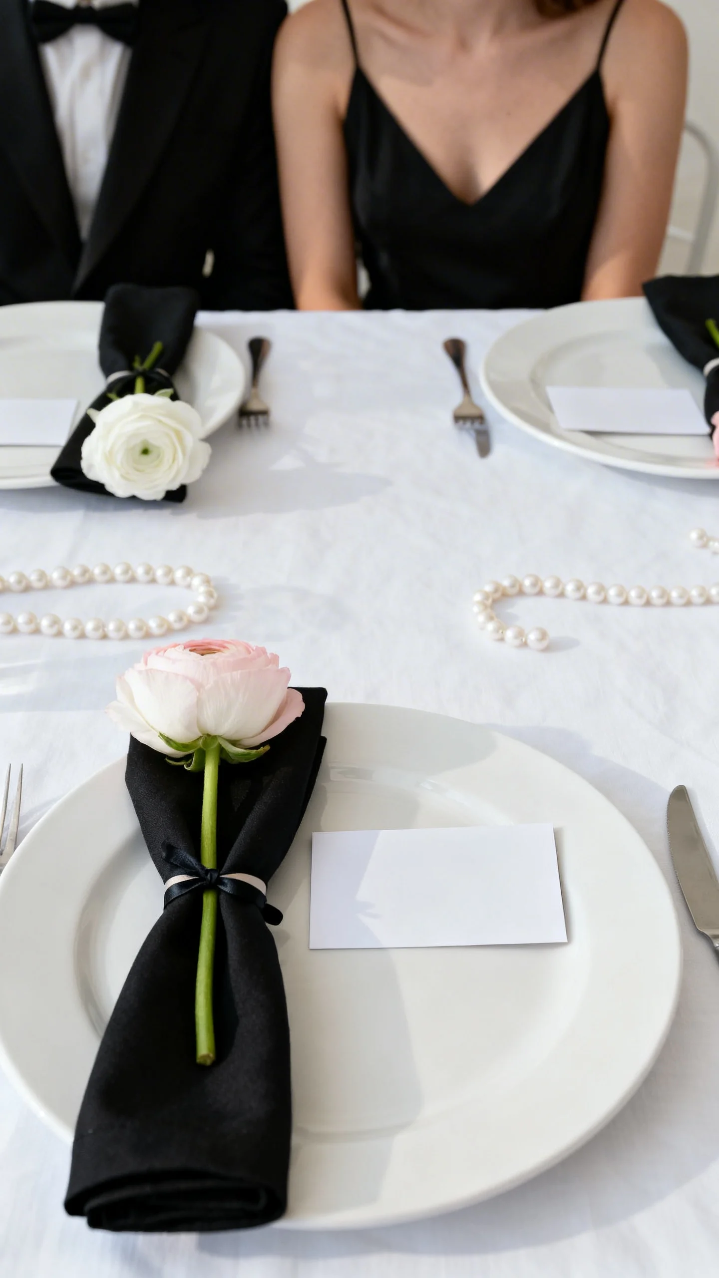 Skip complicated centerpieces and go for clean, tailored place settings. White plates, black napkins, and a simple name card instantly feel elevated. Add a single bloom at each place (a white rose or blush ranunculus) or a mini bundle of baby’s breath tied with ribbon. When every setting matches, the whole room feels curated.