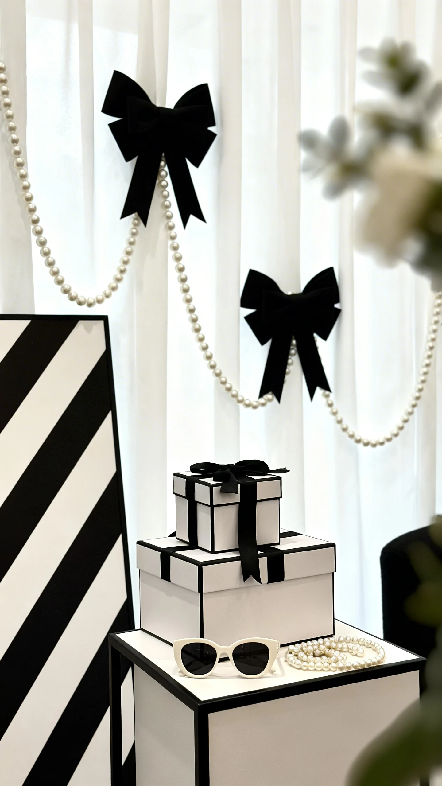 Focus on the style codes instead of the logo: black-and-white contrast, pearls, bows, stripes, and clean typography. Those details read “fashion house” while keeping everything original and budget-friendly. A cohesive palette and consistent signage do most of the heavy lifting.