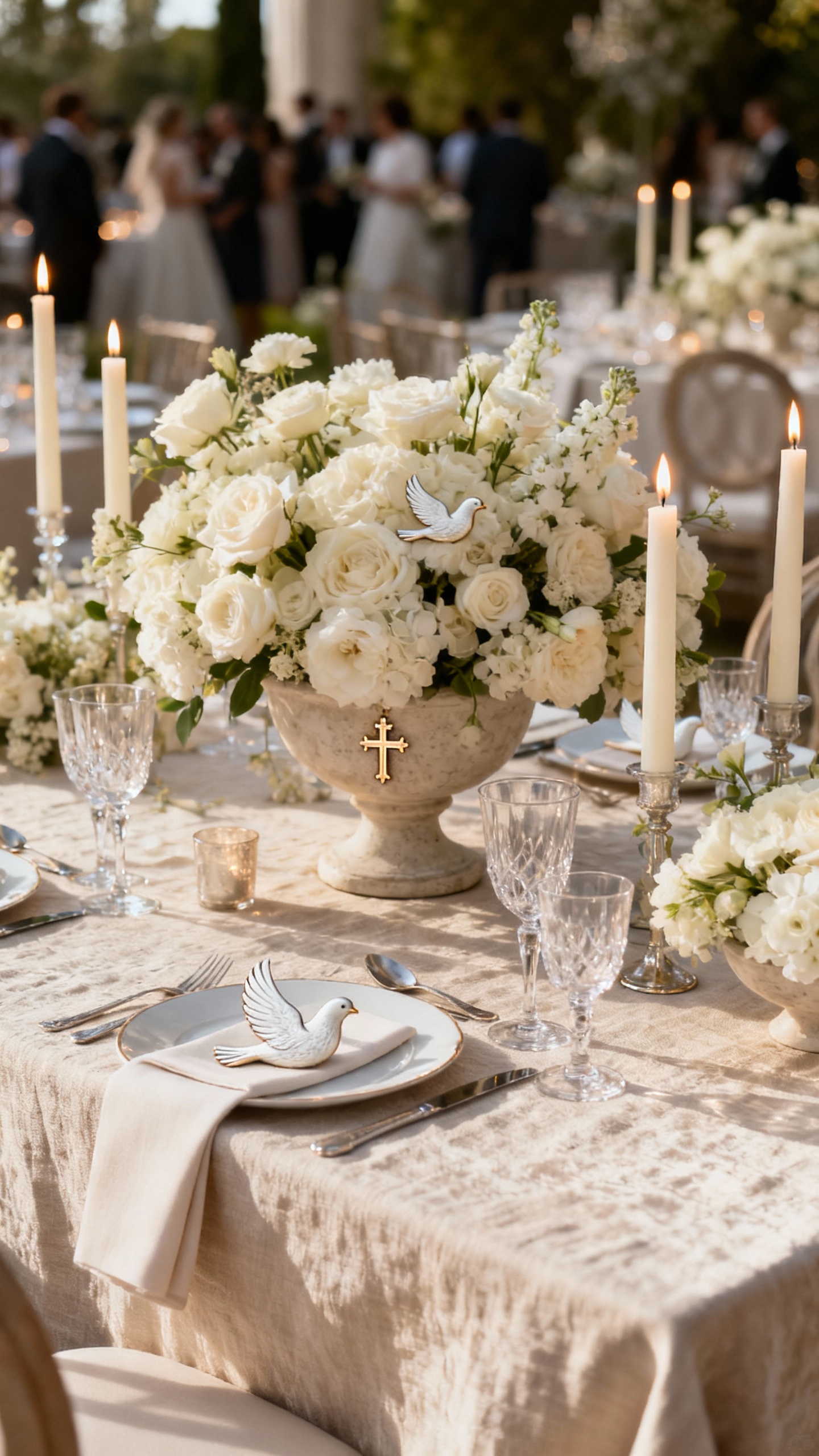 Go all in on layered tables: textured linens, taper candles, compotes overflowing with florals, and subtle cross or dove details in the styling. The key is balance—let the luxe pieces shine while keeping the arrangement heights guest-friendly for conversation. Add a quiet sacred touch with a short blessing line on the menu card or a small verse on the back of the name card.
