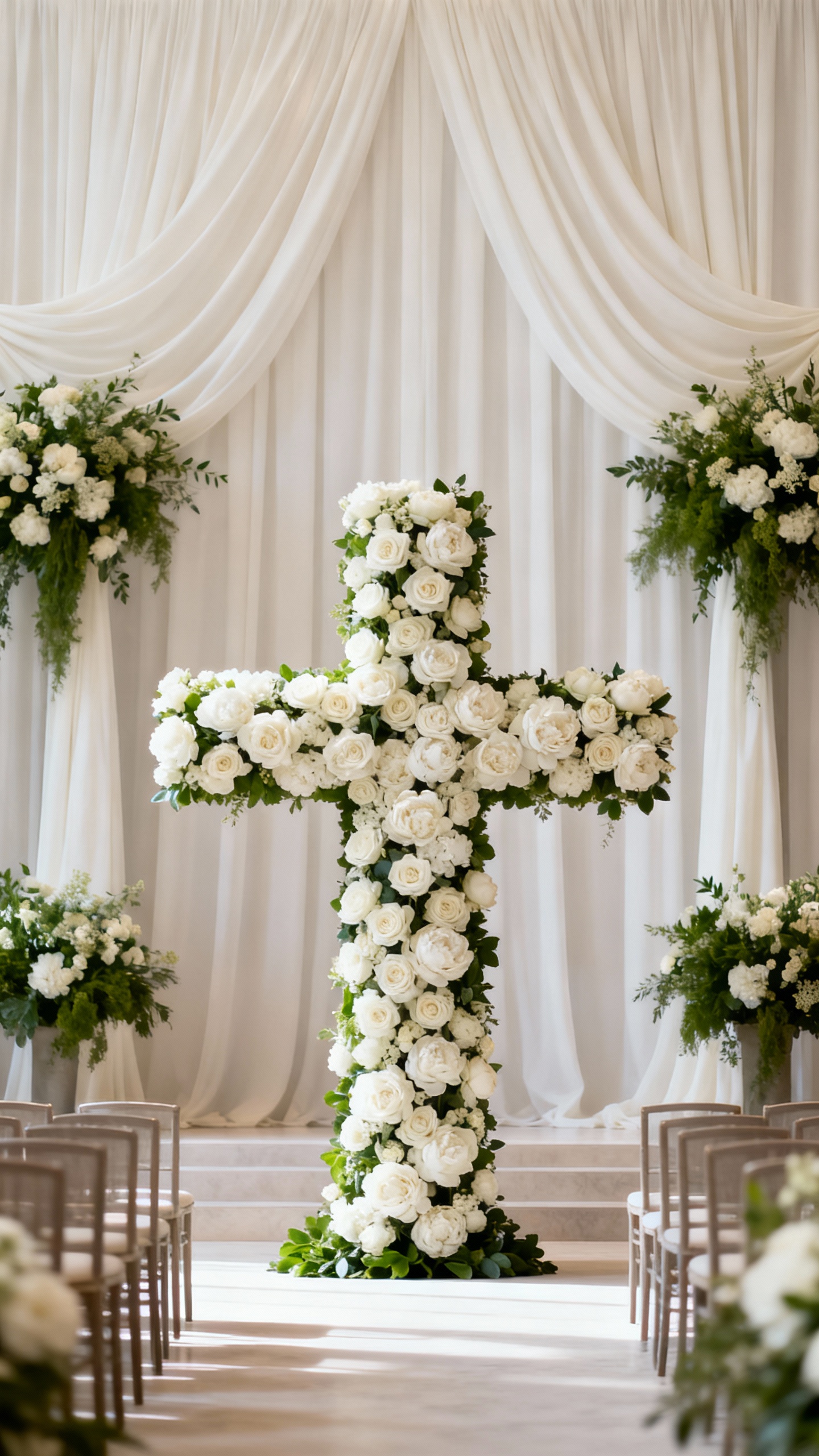 Build your statement moment around a cross or cross-inspired shape using florals, greenery, or layered draping. Keep the design full and intentional, but avoid blocking sightlines so guests can still see you and the officiant. Choose blooms with meaning (like lilies for purity or roses for love) and anchor the base with candles or lanterns for a warm, sacred glow.