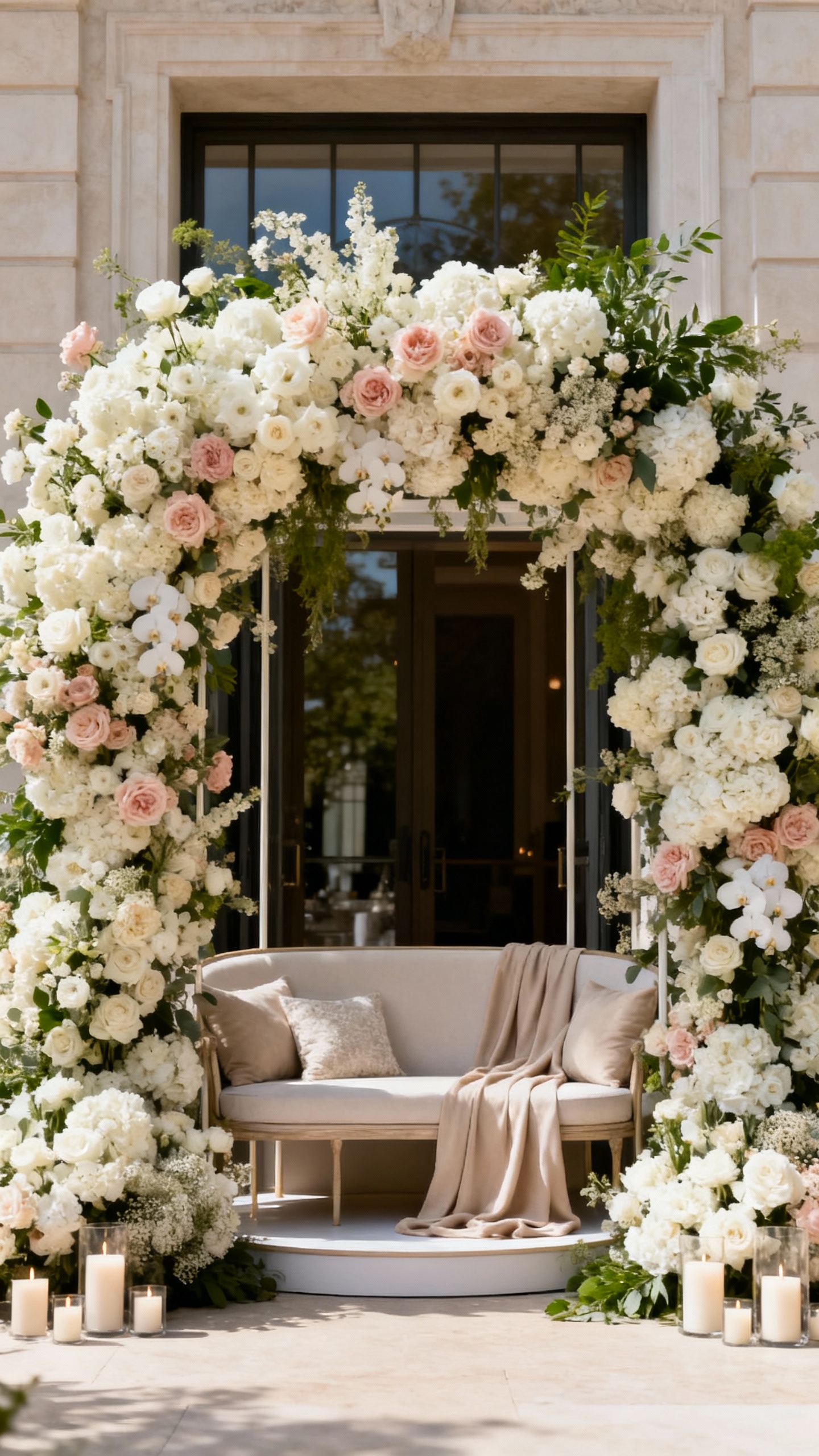Yes—some of the most stunning installations are designed specifically for church architecture. The trick is respecting the space: keep pathways clear, avoid anything that blocks sightlines, and confirm what’s allowed (tape, hooks, candles, attaching to pews). When done well, luxury florals enhance the sanctuary’s beauty and keep the focus on your vows.