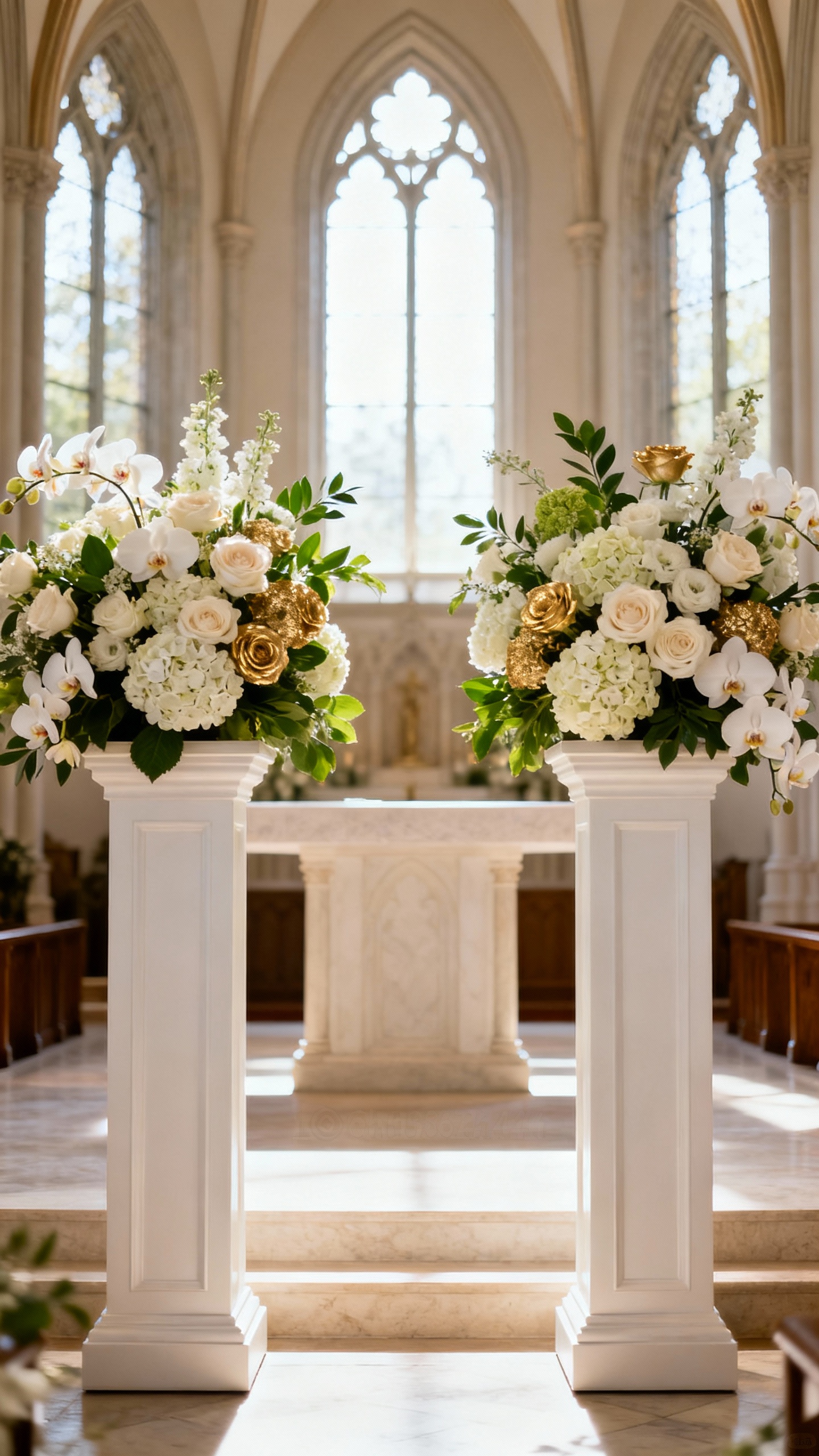 Two (or more) floral pillars at the altar give you a luxury look with clean architecture—especially in churches with classic lines. Tie the palette to a meaningful Scripture or theme (like whites + golds for purity and celebration, or soft blues for peace) and keep the shapes intentional: airy on top, grounded at the base. Your planner can place pillar candles or lanterns nearby to enhance that warm, reverent glow. This setup is also easy to repurpose at the reception entrance.