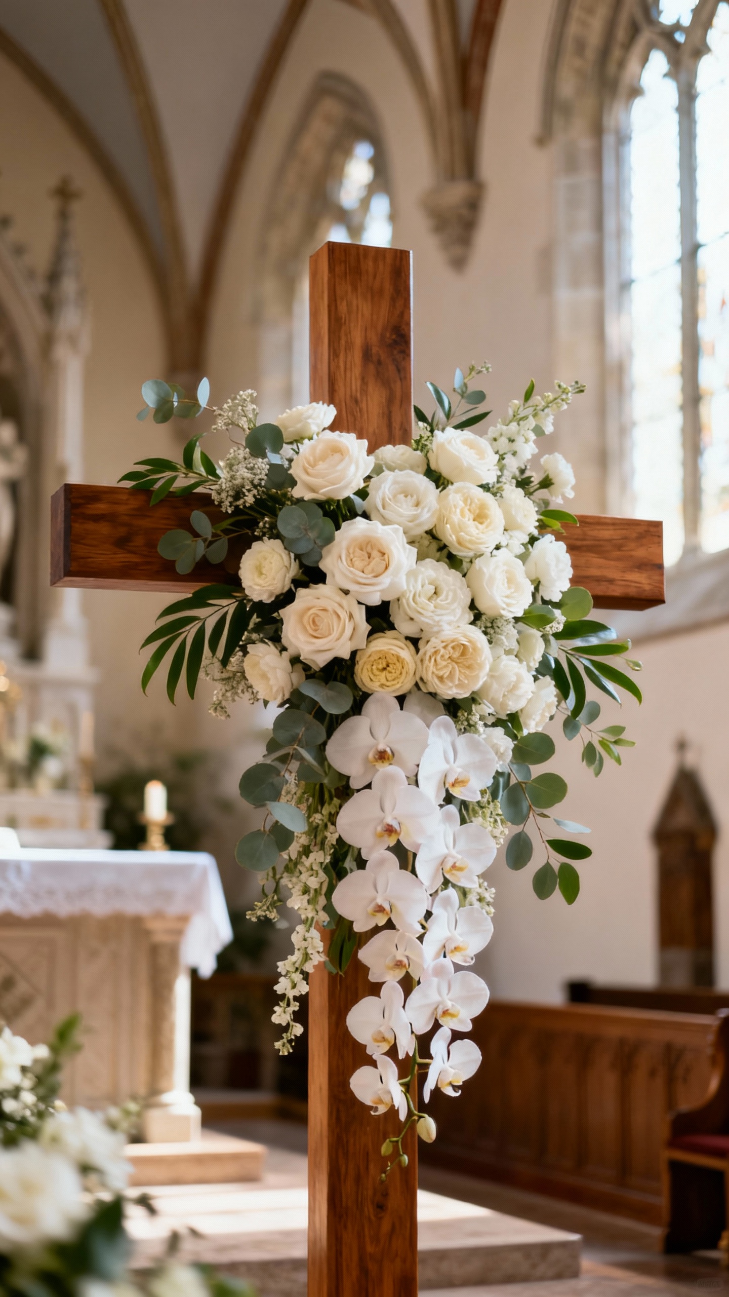 A floral-adorned cross is timeless, symbolic, and instantly creates a focal point for your vows. Keep it luxury by using layered textures (garden roses, ranunculus, orchids) and a mix of greenery for depth. Ask your florist to design it so the cross still reads clearly—lush doesn’t have to mean covered up. Bonus: it photographs beautifully from the aisle and the side angles.
