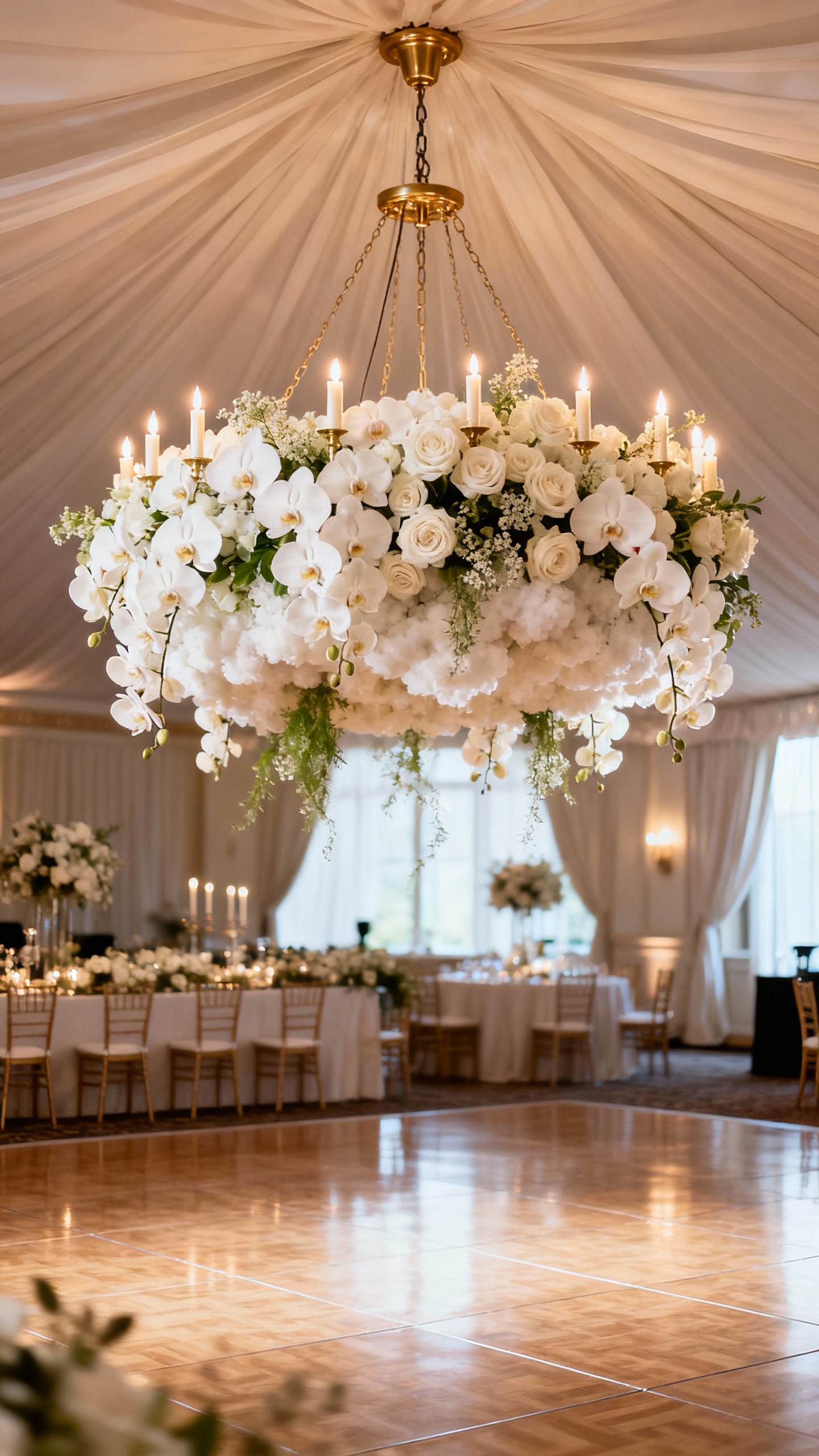 A hanging floral moment over the head table or dance floor is the definition of luxury—guests look up and instantly feel the transformation. Keep it elegant by mixing flowers with delicate greenery, and consider adding subtle elements like crystal drops or soft taper candles (venue permitting). If faith is central to your day, you can weave in meaning through the shape (a gentle oval “halo” over the table) or by pairing it with a meaningful sign nearby. Make sure your team budgets for rigging and strike time—installations like this need a pro schedule.