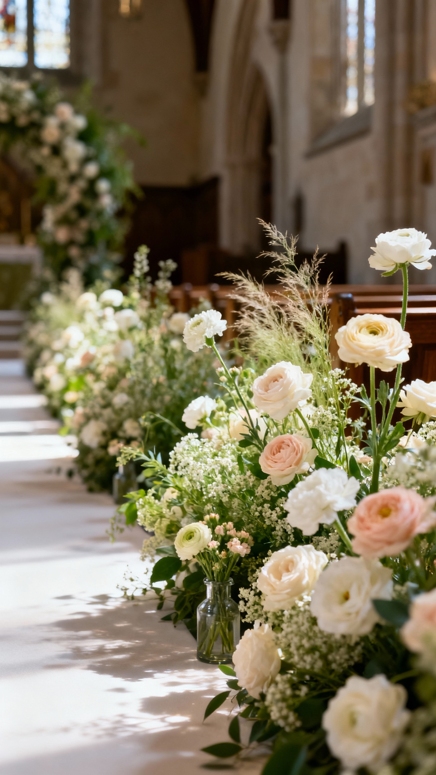 An aisle meadow feels romantic and high-end because it looks like the ceremony grew there on purpose. Use clusters of blooms at varying heights (with some “just picked” movement) instead of identical markers every few rows. It also works perfectly for Christian ceremonies since it frames your walk down the aisle in a soft, sacred way—without distracting from the moment. Pro tip: focus the densest florals near the altar for maximum impact on camera.