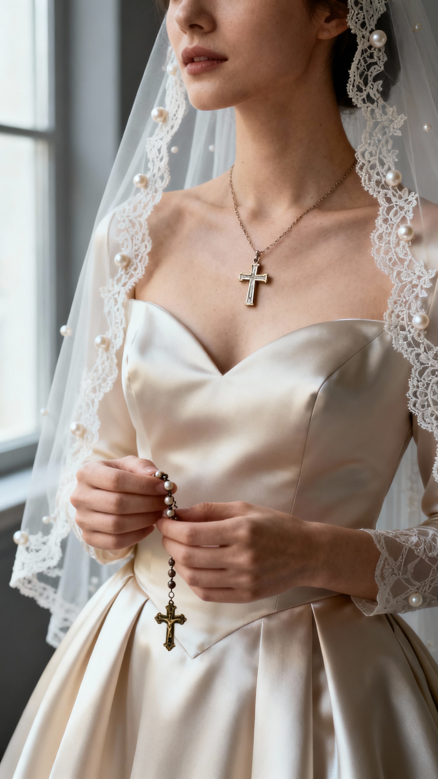 Luxury is often in the details: a lace-trim veil, pearl accents, or a gown silhouette that nods to timeless bridal style. Add one meaningful piece like a family rosary, cross necklace, or a handkerchief embroidered with a verse or wedding date. Keep hair and makeup polished and soft so your look photographs timelessly for decades.