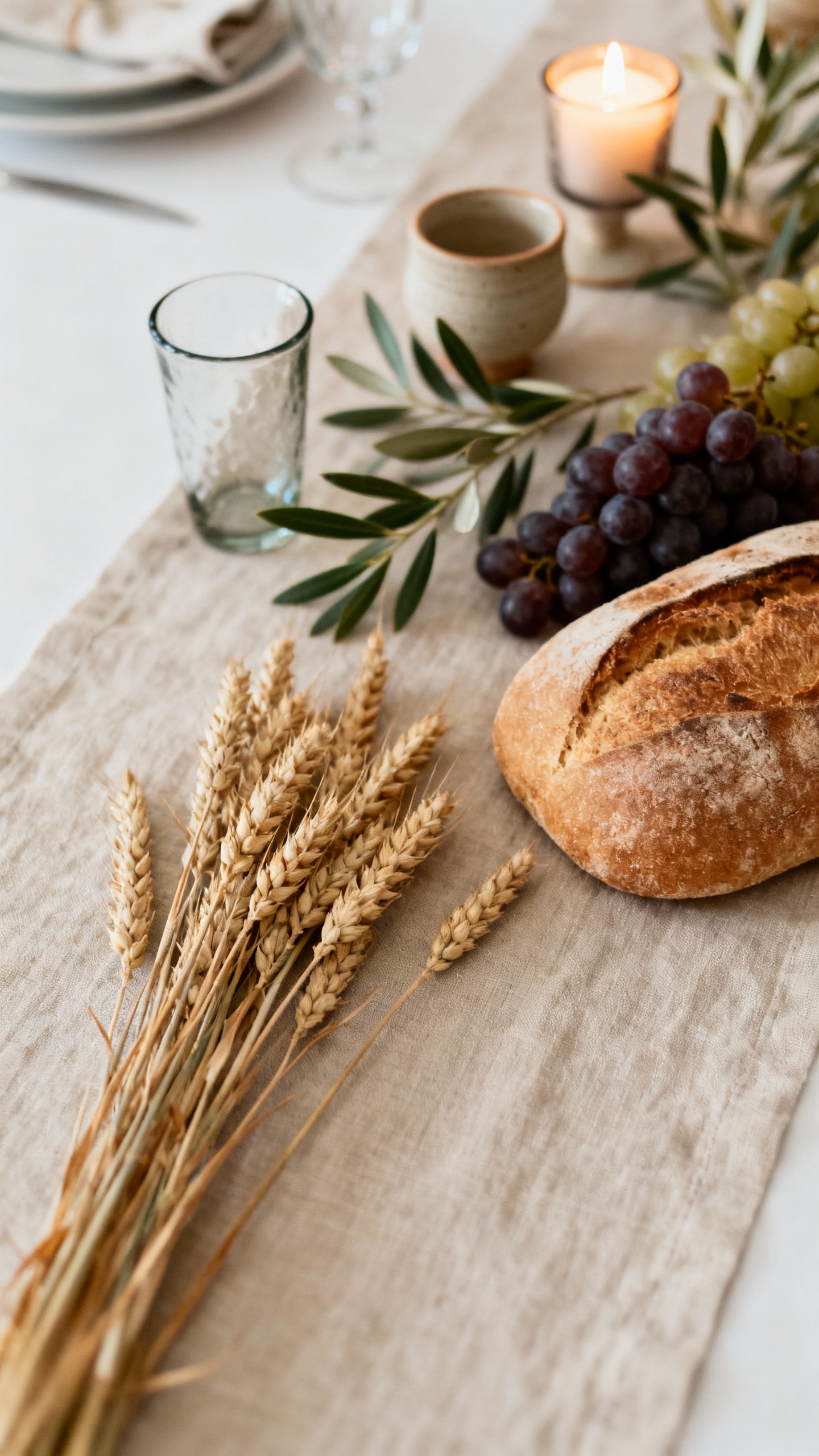 If communion is part of your ceremony (or meaningful to your relationship), echo it subtly in your decor styling. On a details or dessert table, use a linen runner, wheat-like dried stems, and warm candlelight to nod to “bread” and “cup” symbolism without turning it into a theme party. A framed verse like John 15 (“abide”) or a short blessing sign can sit beside the display. Keep the styling refined and minimal so it reads as intentional and sacred, not literal.