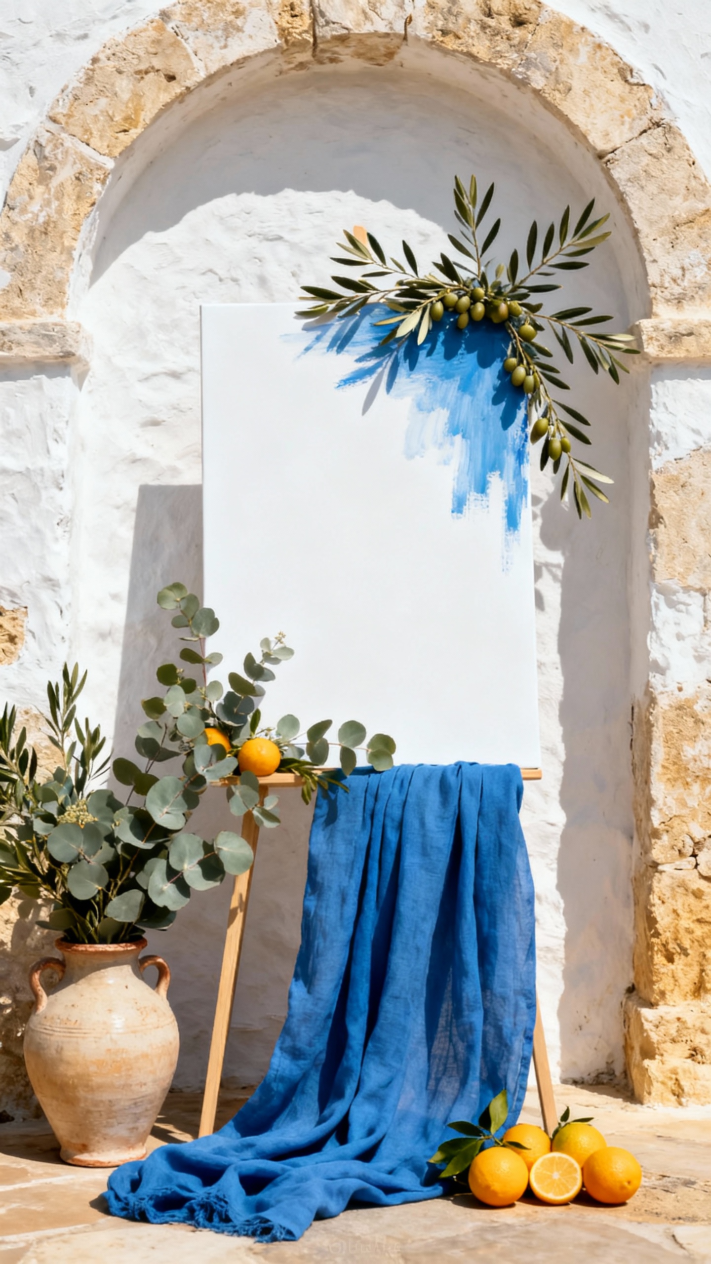 Start with warm neutrals (ivory, sand, oatmeal), then add coastal blue, soft terracotta, and leafy greens from olive branches. Gold accents photograph beautifully at sunset and feel timeless in a church setting. Keep it to 3–5 core colors so your photos look cohesive.