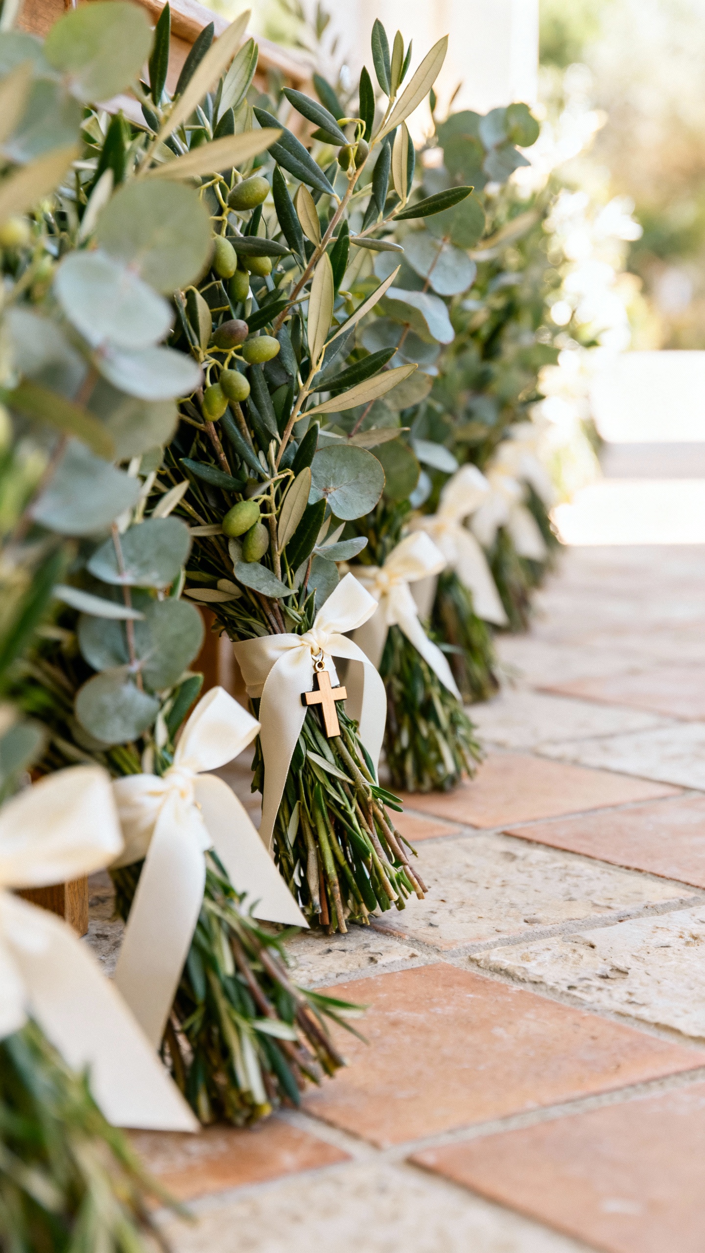 Line your ceremony aisle with olive branches (hello, Mediterranean icon) mixed with eucalyptus for volume and an effortless look. Tie each cluster with ivory ribbon and add a small cross charm, wooden tag, or pressed-leaf cross tucked into the greenery for a quiet Christian touch. Keep the spacing consistent so photos look clean from every angle. Bonus: reuse the arrangements on the sweetheart table or bar after the ceremony.