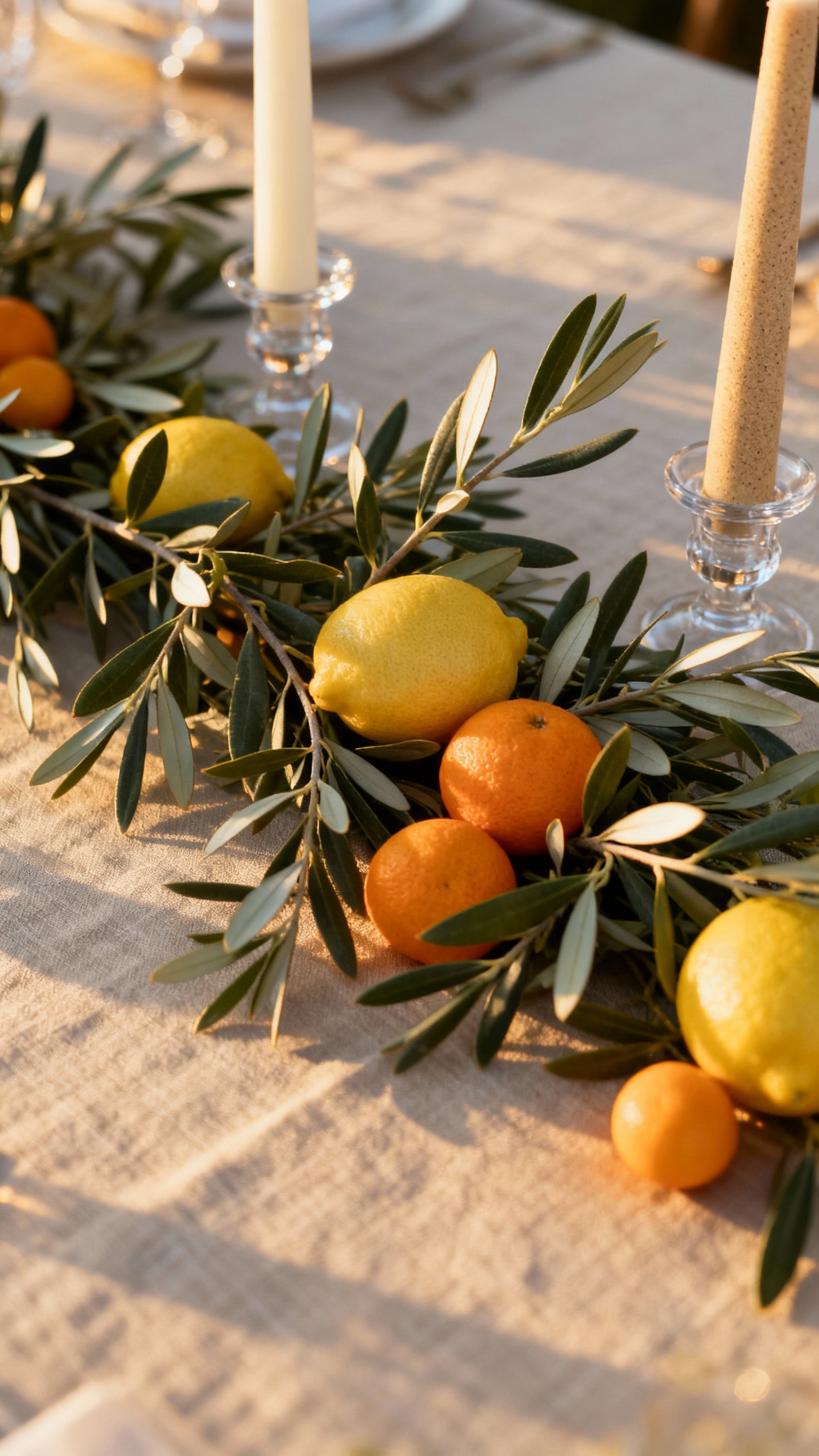 3) Citrus + Olive Centerpieces with Candles (Not Overcomplicated)