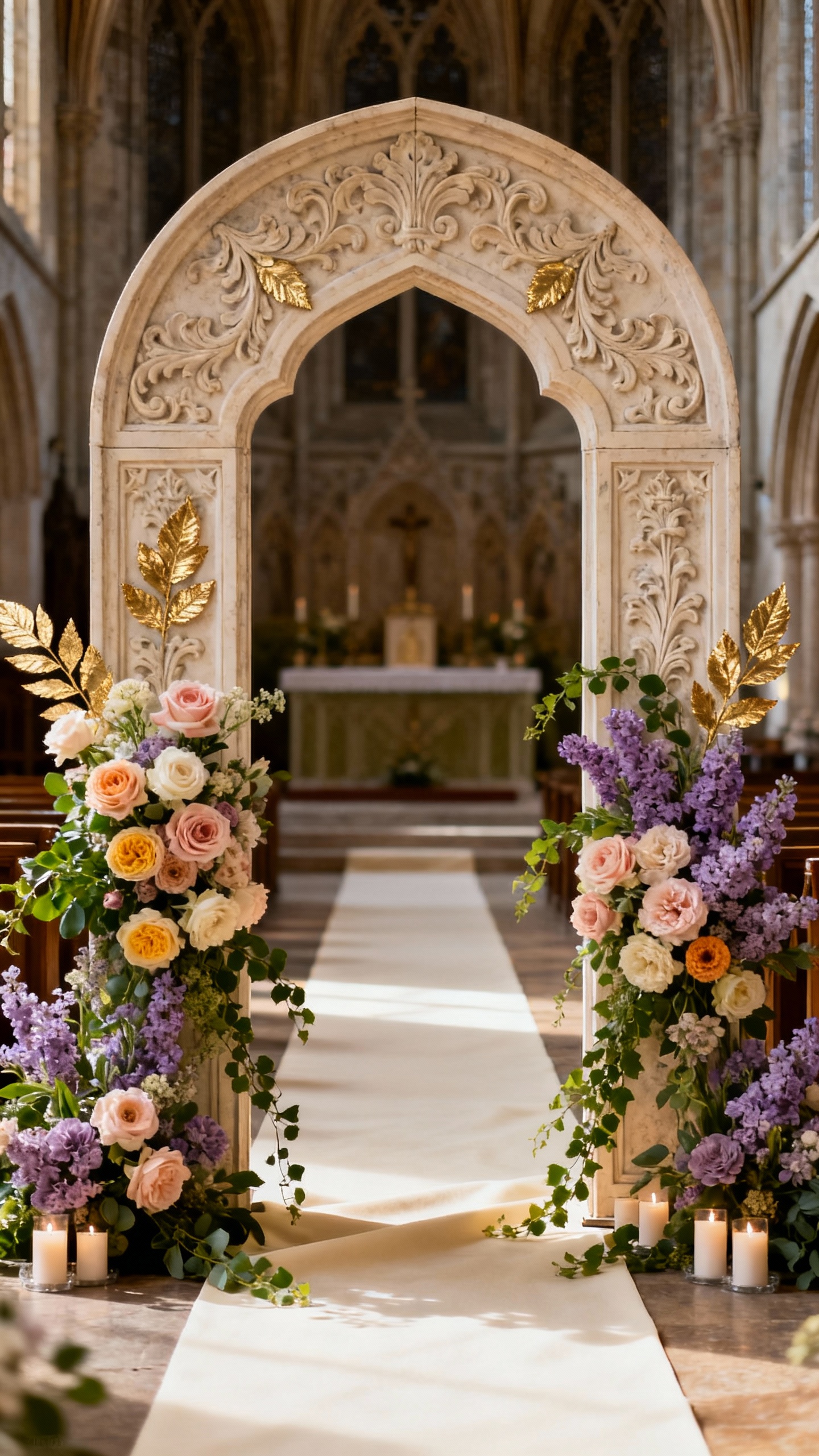 Create a focal point that nods to church architecture: an arched frame, ornate panels, or a carved “reredos” look behind you. Layer in soft florals (garden roses, ranunculus, lilac) and subtle gold detailing so it reads Rococo, not heavy. If your venue allows, add two tall taper-candle arrangements to give it that sacred, glowing presence.