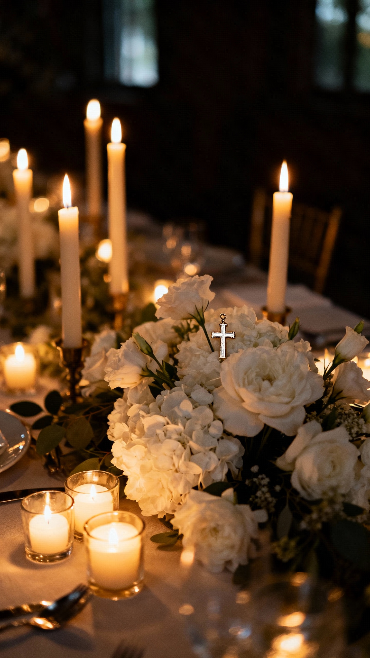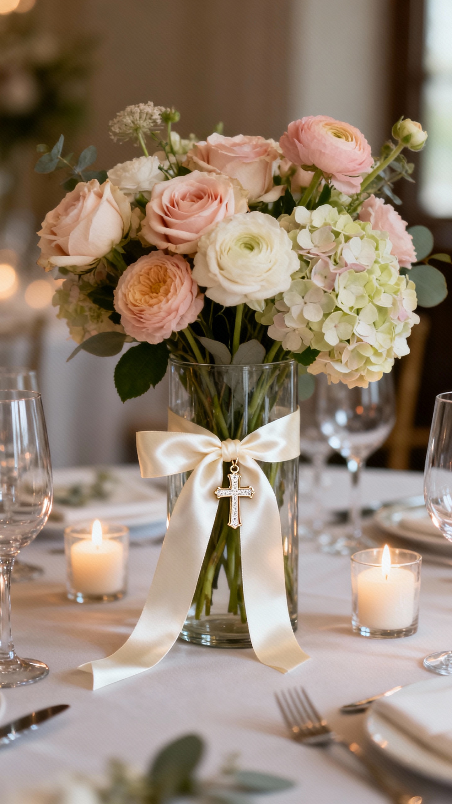 Build your centerpiece around timeless florals (roses, ranunculus, hydrangea) and add a small, understated cross detail—like a petite cross charm tied to the vase with silk ribbon. The key is scale: the cross should feel like a thoughtful accent, not the main event. Stick to your wedding metals (gold, silver, matte black) to keep everything cohesive. This works beautifully for both round tables and long farm tables.