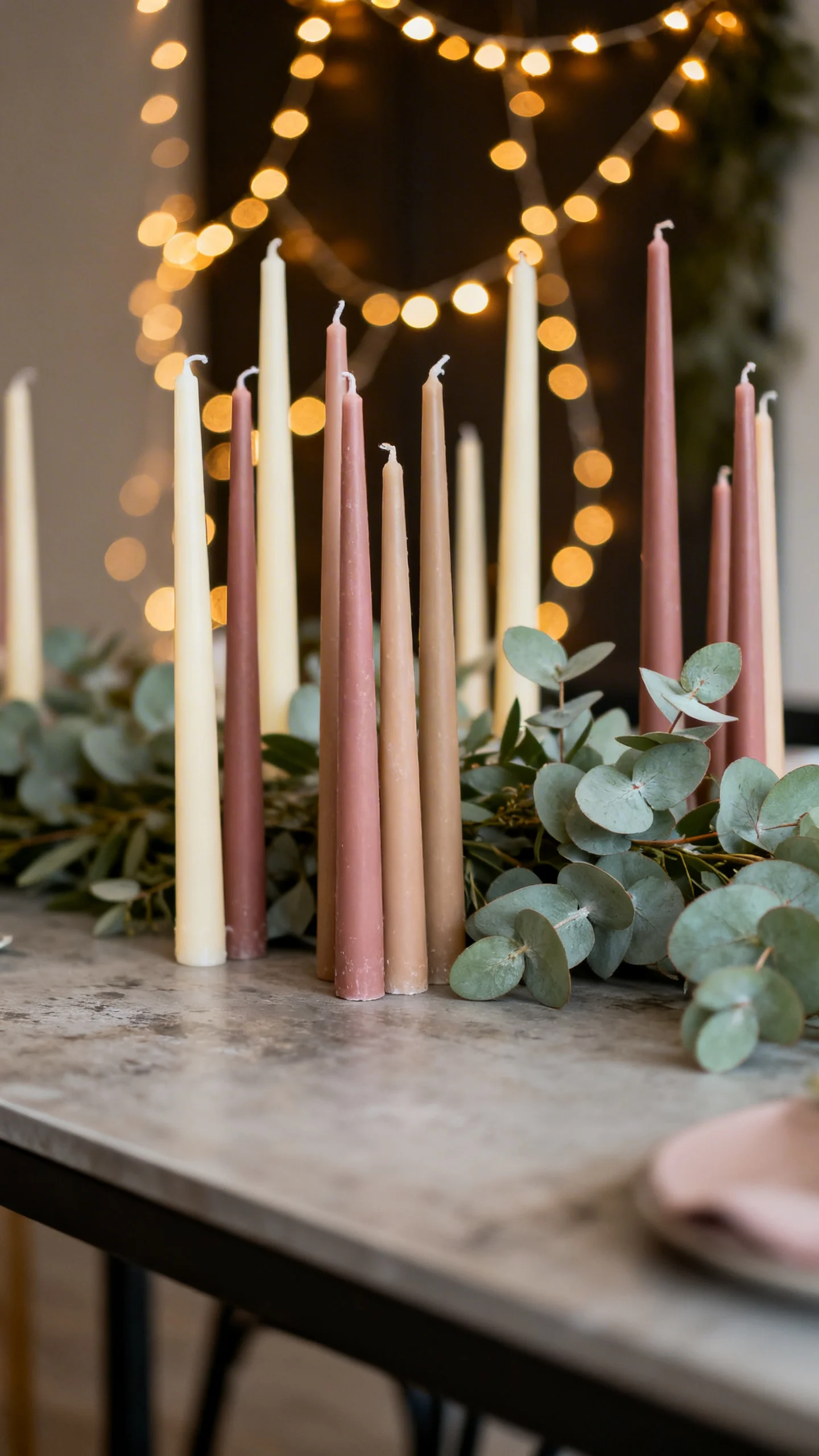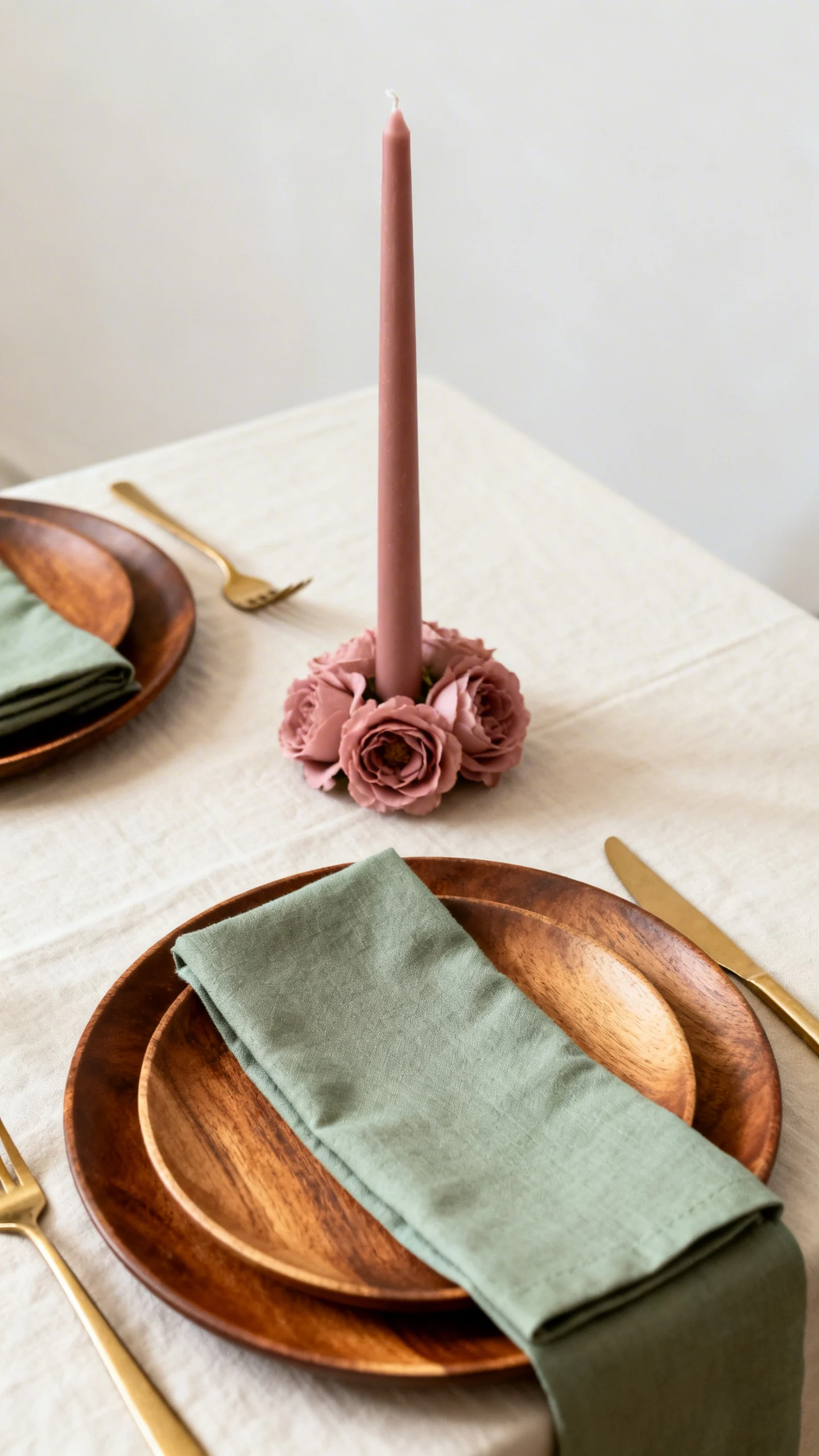 Warm light is your best friend with cream and mocha—avoid cool white bulbs that can make everything look gray. Use taper candles in cream, dusty rose, or even soft mocha to tie into the palette without adding clutter. Sage looks especially pretty under warm string lights, giving greenery a velvety tone. Cluster candles at varying heights for a modern, editorial look.