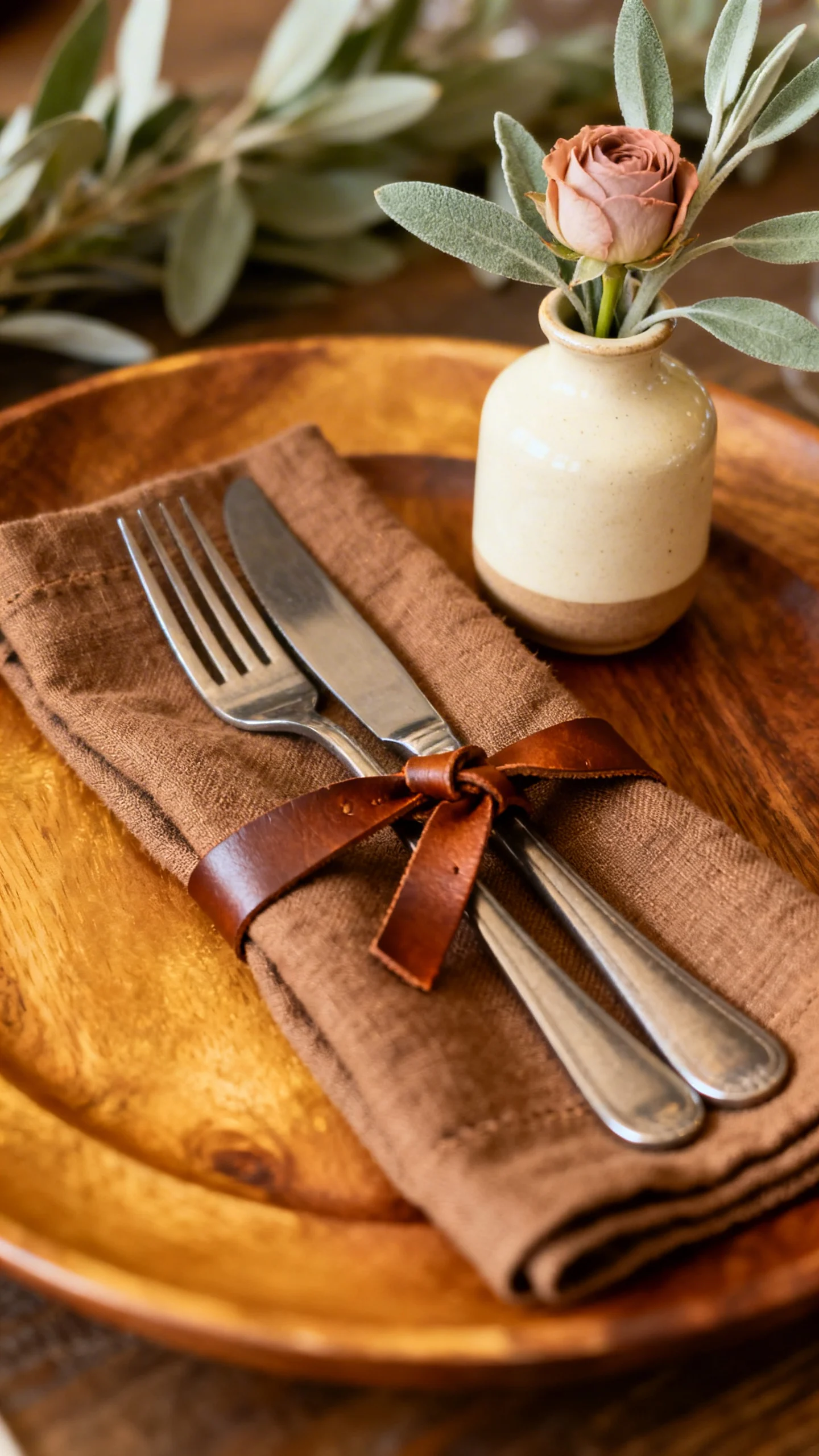 Start with cream linens, then layer in mocha chargers or wood plates for warmth. Add sage through menus, napkins, or greenery runners, and let dusty rose appear in florals or a single tabletop element like taper candles. This “neutral base + gentle accent” approach keeps rustic venues from looking busy. Choose one metal finish—brushed gold or warm pewter—to keep it modern.