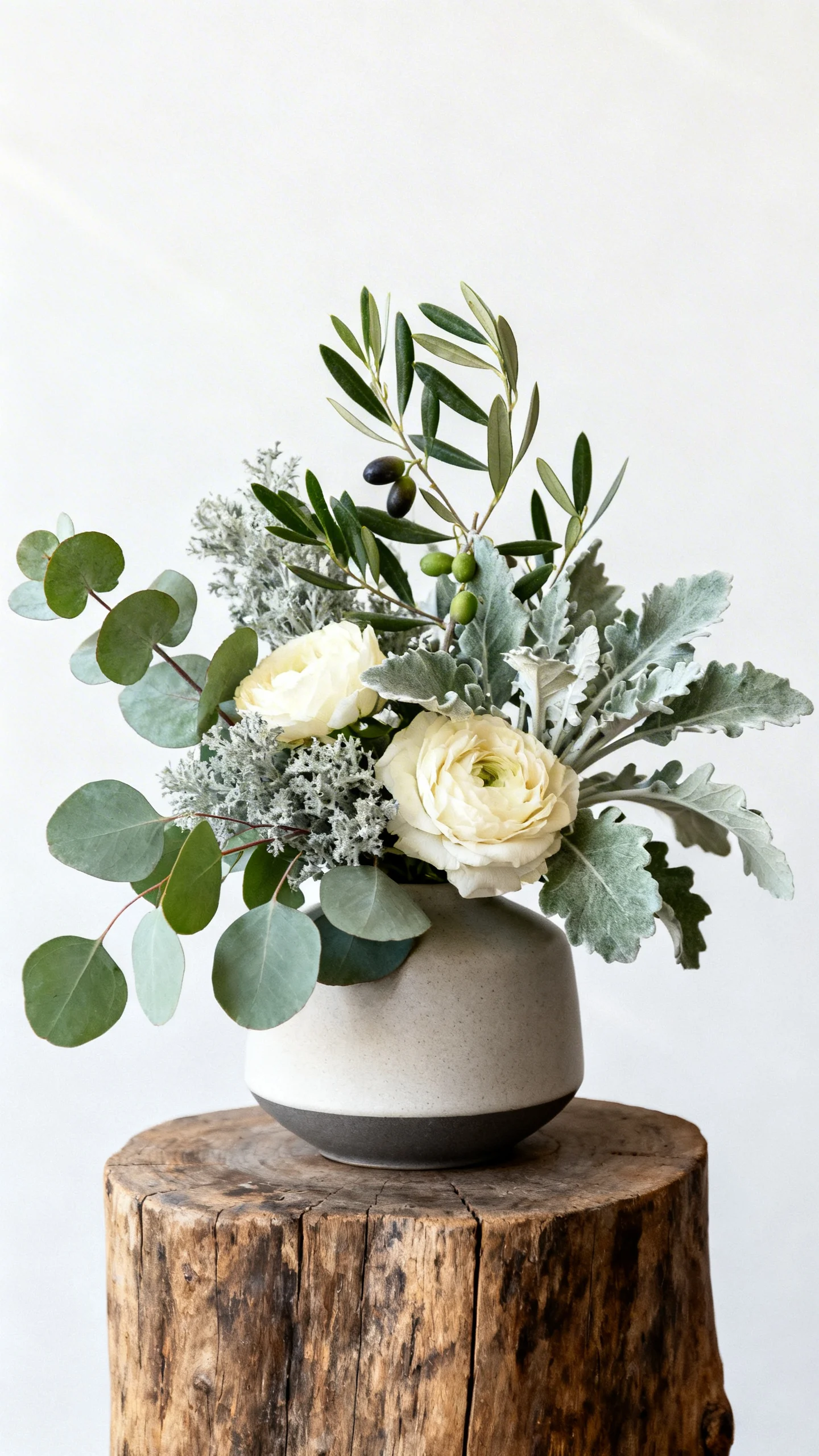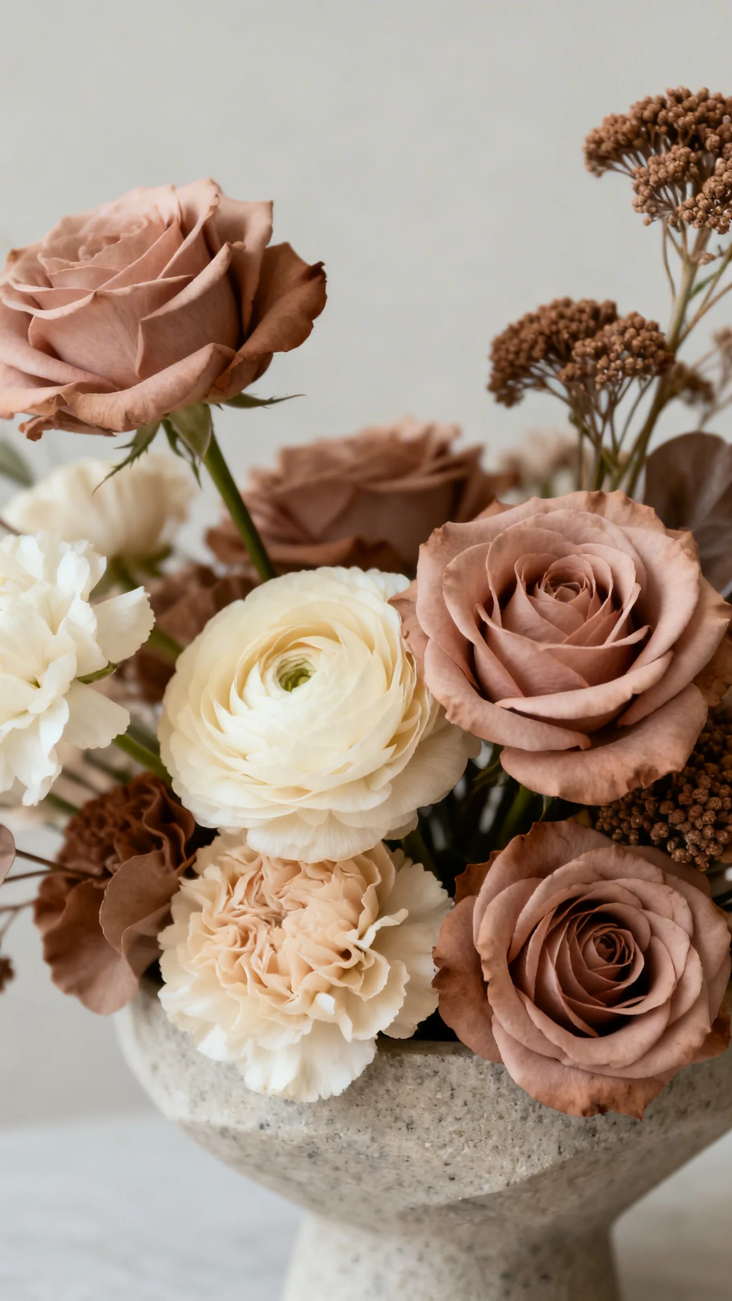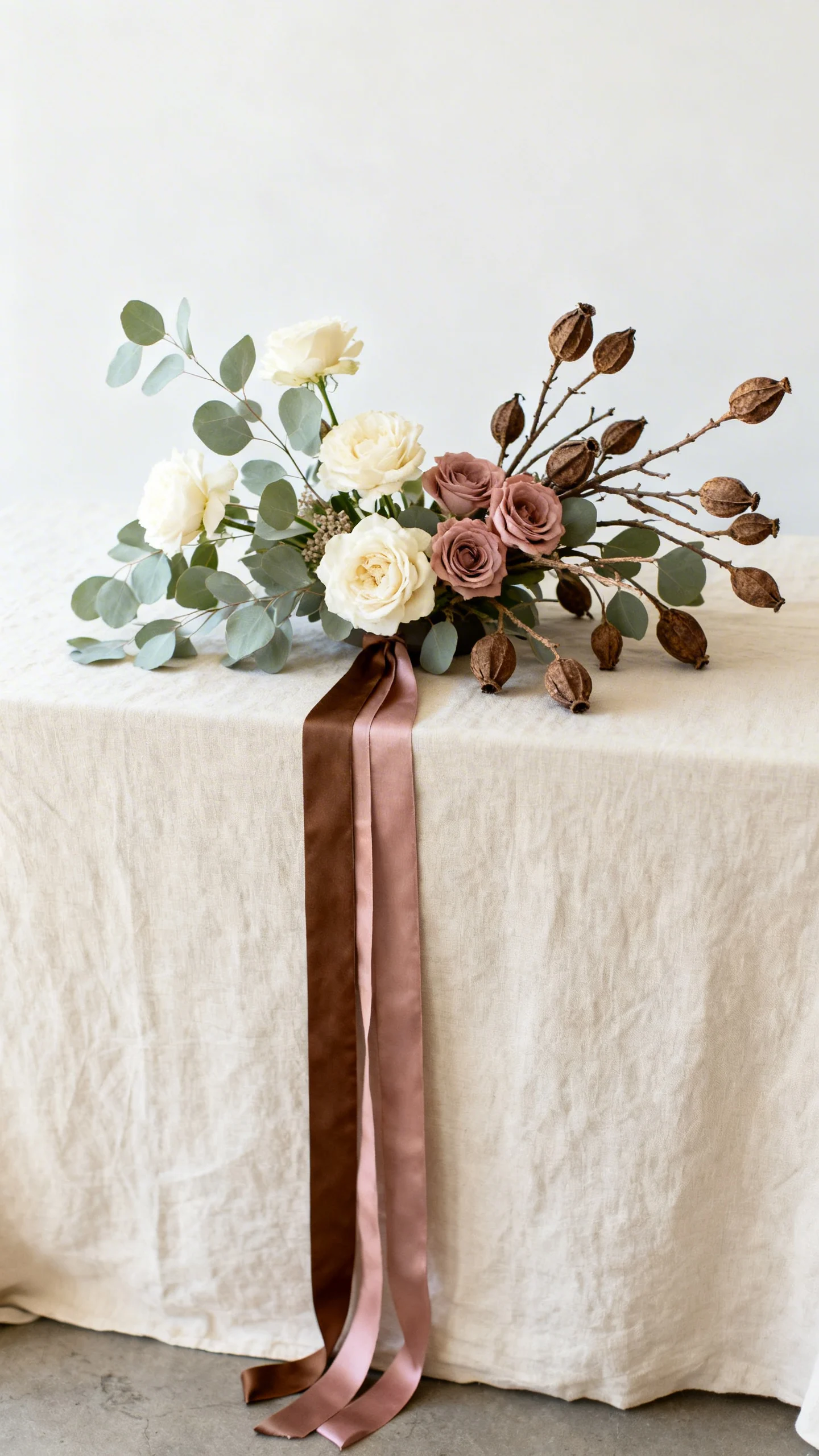 Focus on fewer, larger statement arrangements rather than many small ones. Pair cream blooms with sage foliage, then sprinkle in dusty rose highlights and mocha elements like dried pods or subtle branches. Keep shapes a little airy and asymmetrical for a current feel. Finish with clean ribbon tails in mocha or dusty rose for movement in photos.