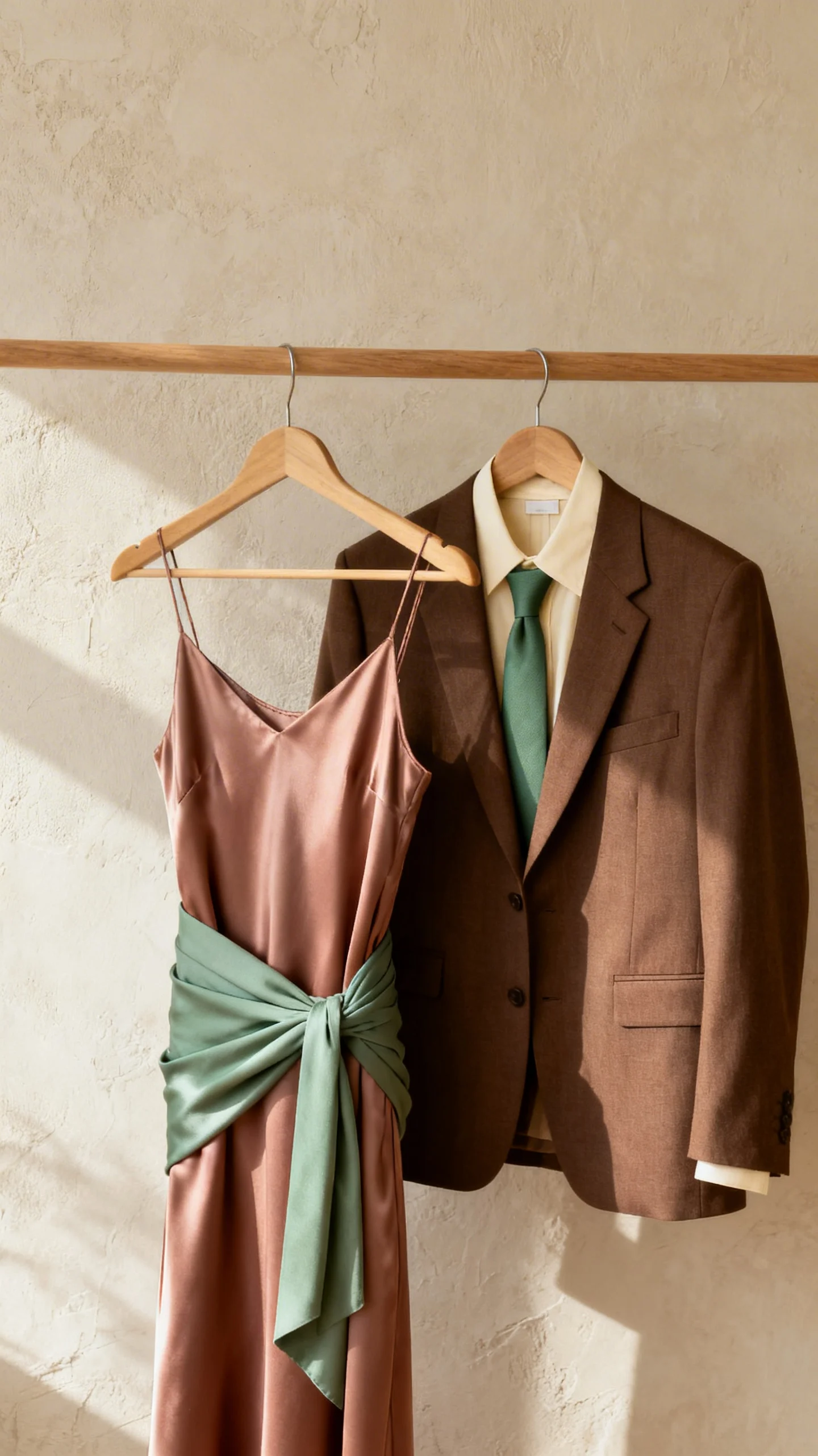 For bridesmaids, mocha and dusty rose dresses look stunning together, especially in mixed fabrics like satin and chiffon. Sage can show up in one dress shade, wraps, or bouquets for a softer mix-and-match lineup. For groomsmen, mocha suits or tan suits with sage ties feel on-theme without looking themed. Cream shirts and warm boutonnieres keep the palette cohesive.