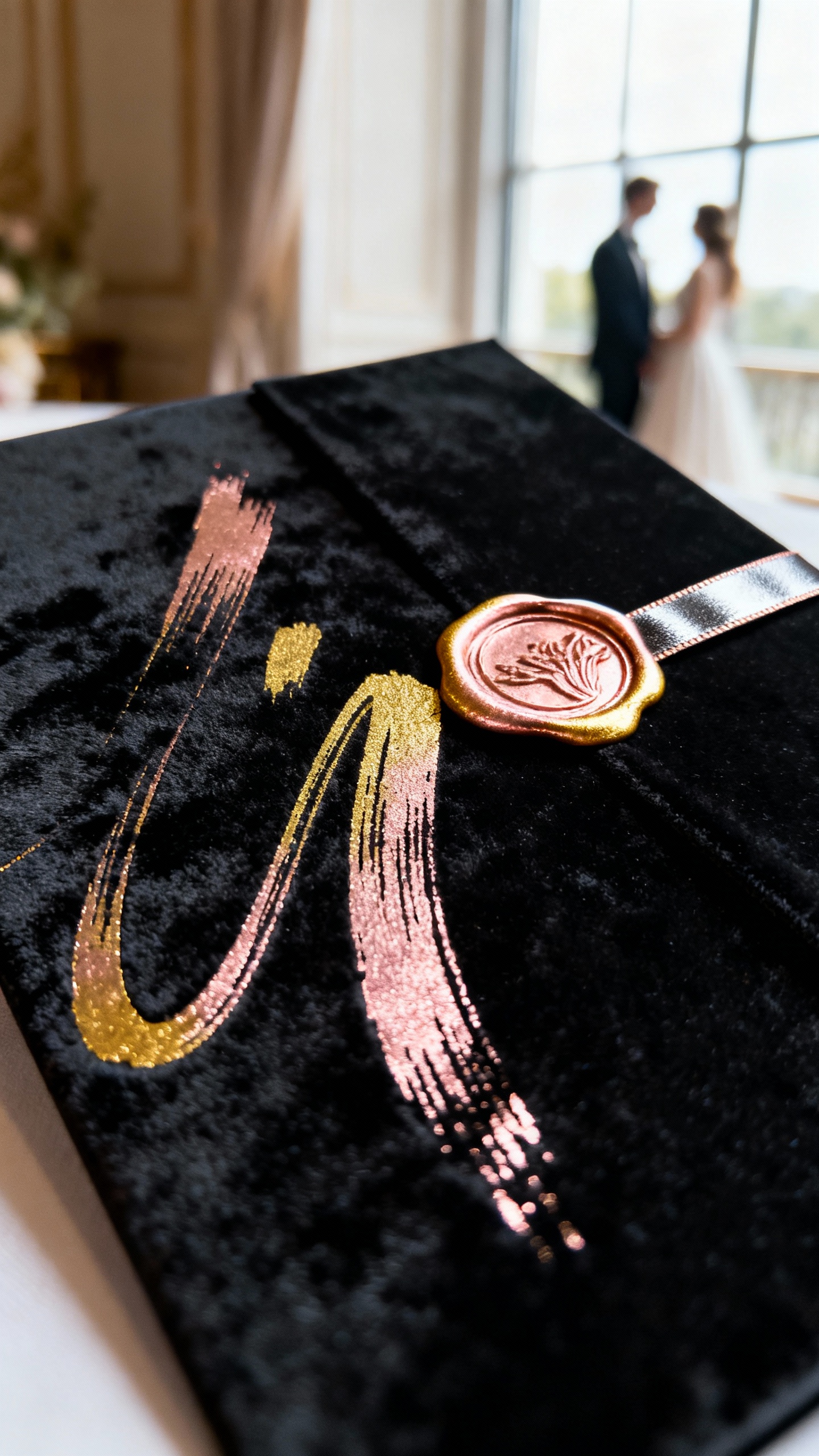 Want a statement invitation that looks like a styled shoot? Try black acrylic with white ink, or a black printed card topped with a vellum overlay and wax seal. Keep the wording short on the overlay and put the full details on a separate card so nothing feels crowded. This option shines for modern venues and candlelit receptions.
