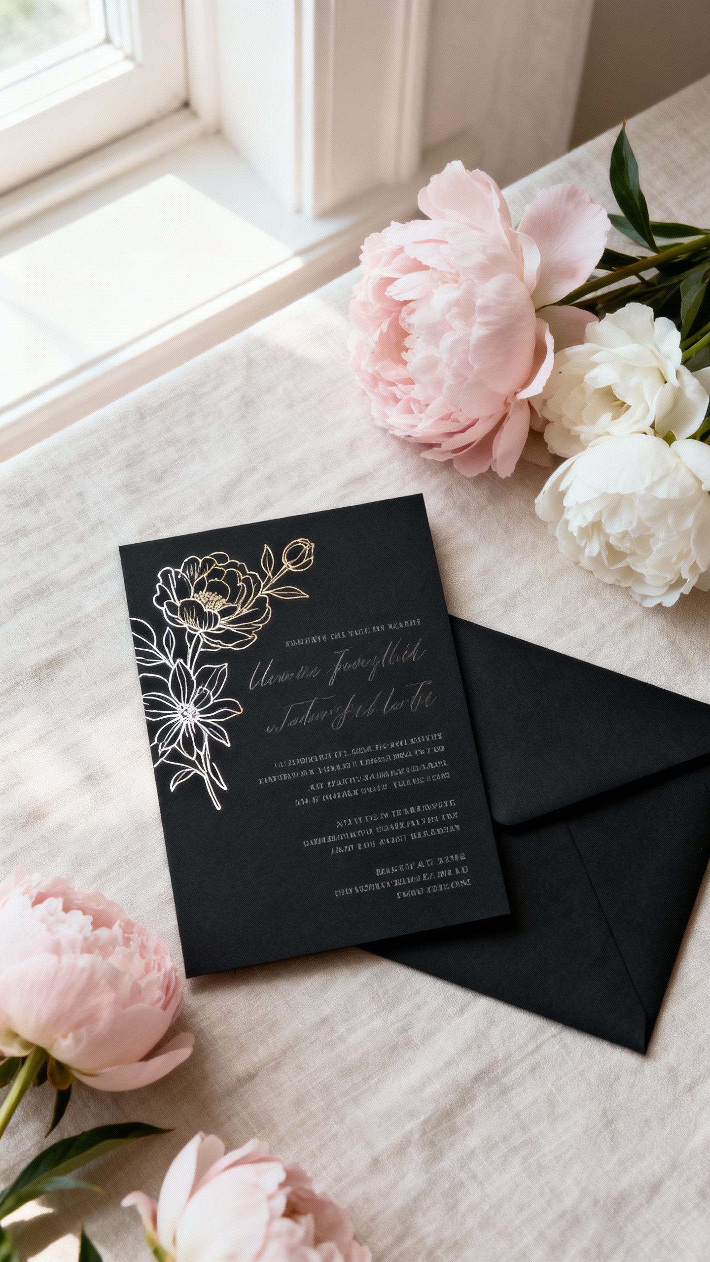 For a romantic look that still feels bold, choose black stationery with delicate floral line drawings. White ink keeps it airy; metallic ink adds glow without going full glitter. This style is perfect for garden-at-night weddings, moody fall palettes, or couples who want soft details on a dramatic base.