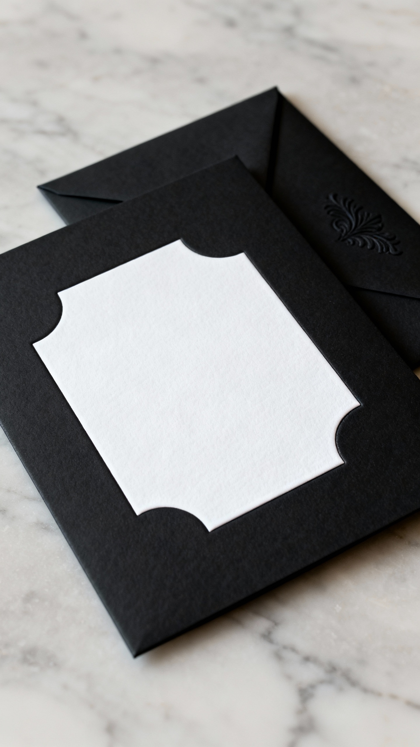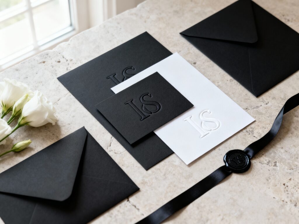Black envelopes are stunning, but consider your mailing situation: they can show scuffs more easily. Popular pairings are white, ivory, or taupe envelopes for contrast, or black envelopes with a white ink address for a dramatic look. A liner (metallic, marbled, or botanical) adds a surprise “wow” when guests open it.