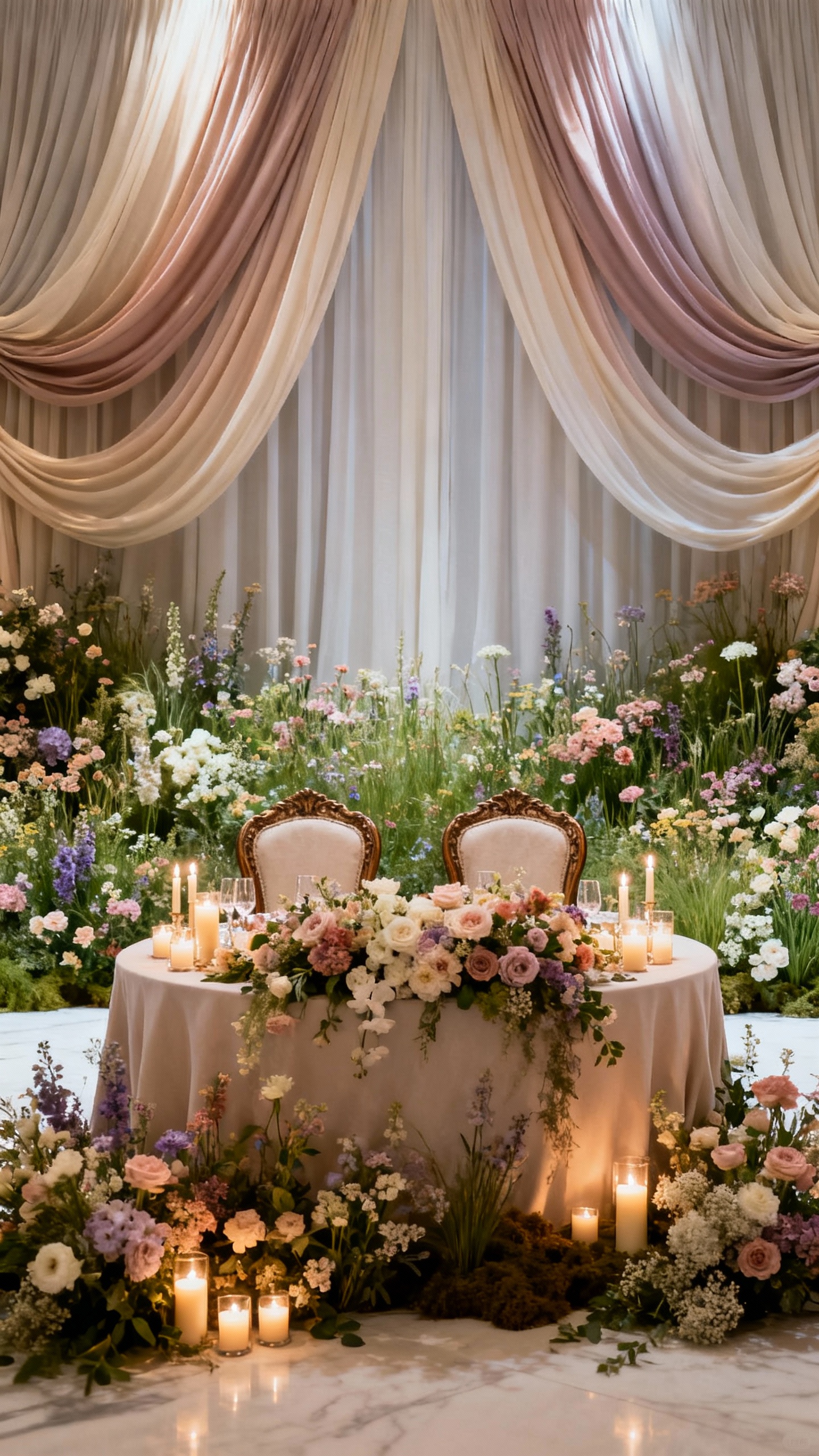 Your sweetheart or head table is basically the reception’s main character, so give it its own styling moment. Think dramatic backdrop (draping, florals, or structured panels), a slightly different chair choice, and extra candle clusters for glow. Keep the design tied to the rest of the room so it feels intentional, not like a separate set.