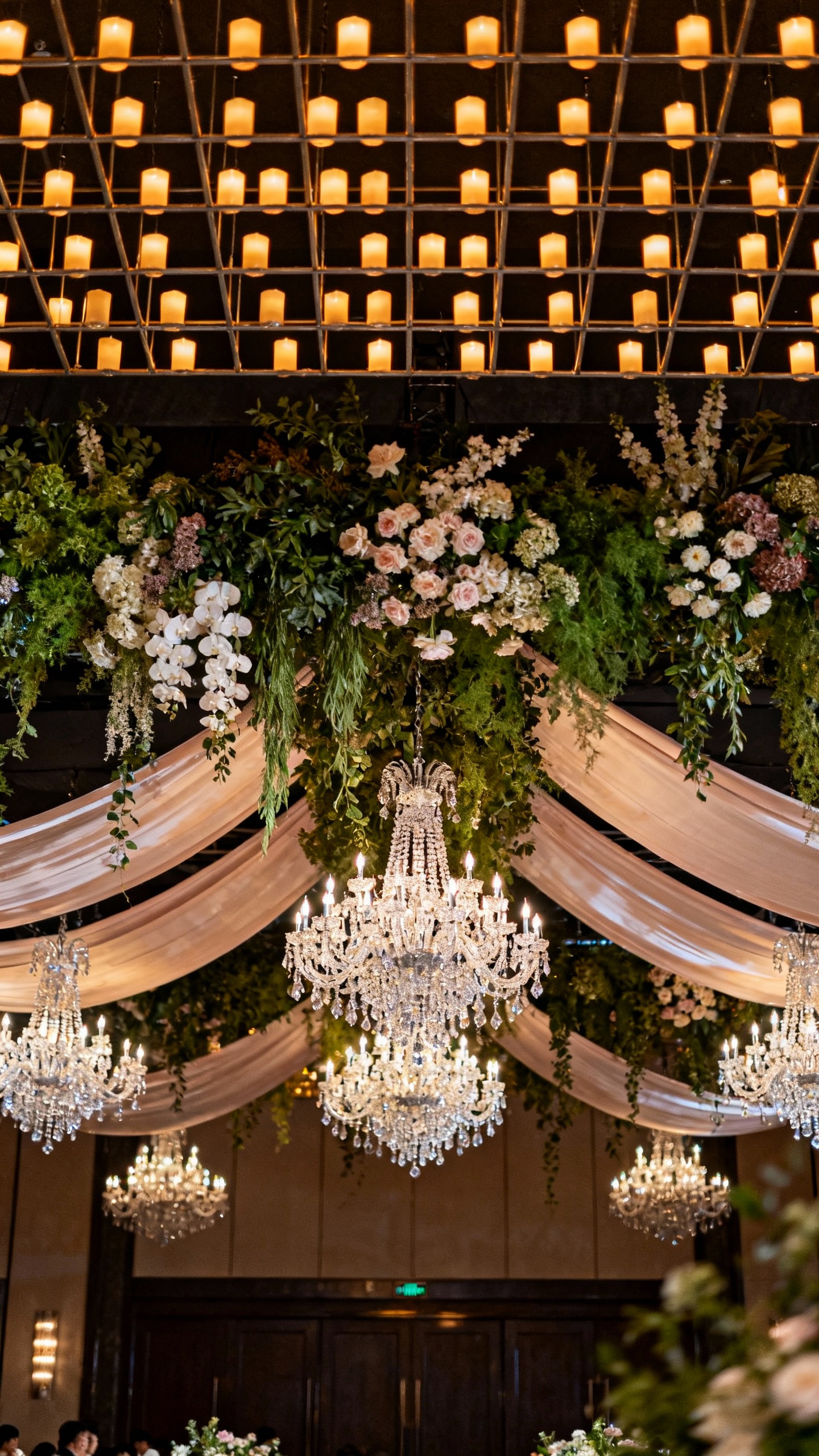 If you want instant wow, look up. Add chandeliers, floral installations, draped fabric, or a grid of hanging candles (LED for safety) to bring the drama overhead. This draws the eye upward, makes the room feel larger, and turns every wide-angle photo into a Pinterest save.