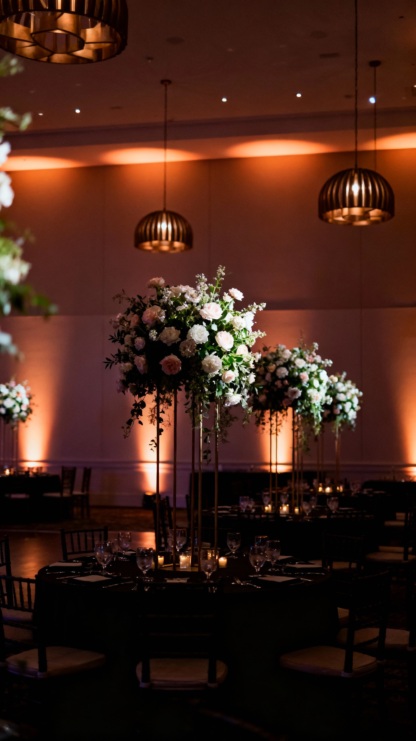 Great lighting is the difference between “pretty” and “cinematic.” Combine warm pin-spot lighting for centerpieces, soft washes on walls, and a few statement fixtures to create depth. Ask your lighting team to avoid harsh white tones—warm, golden light makes skin, florals, and champagne all look better.
