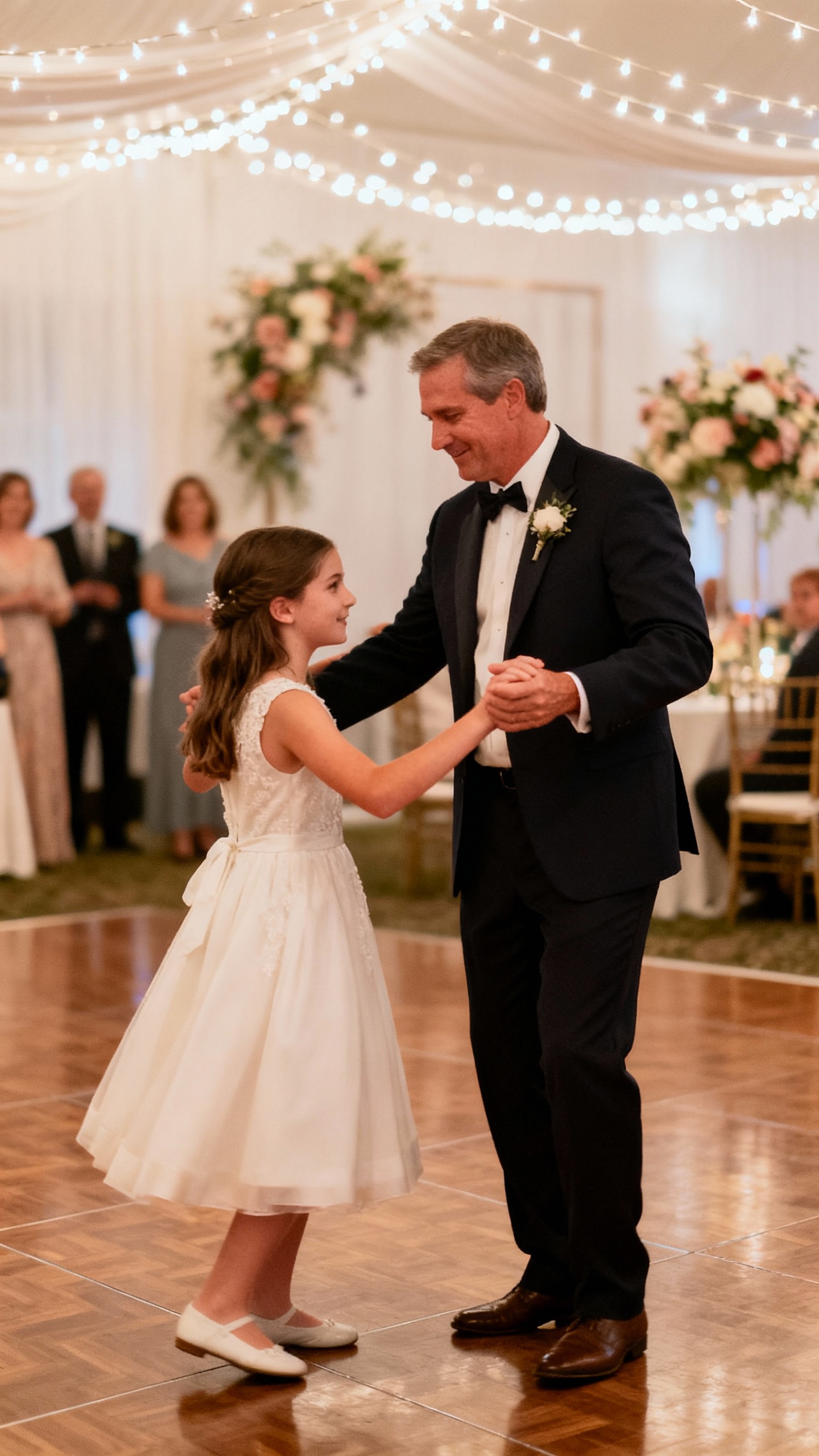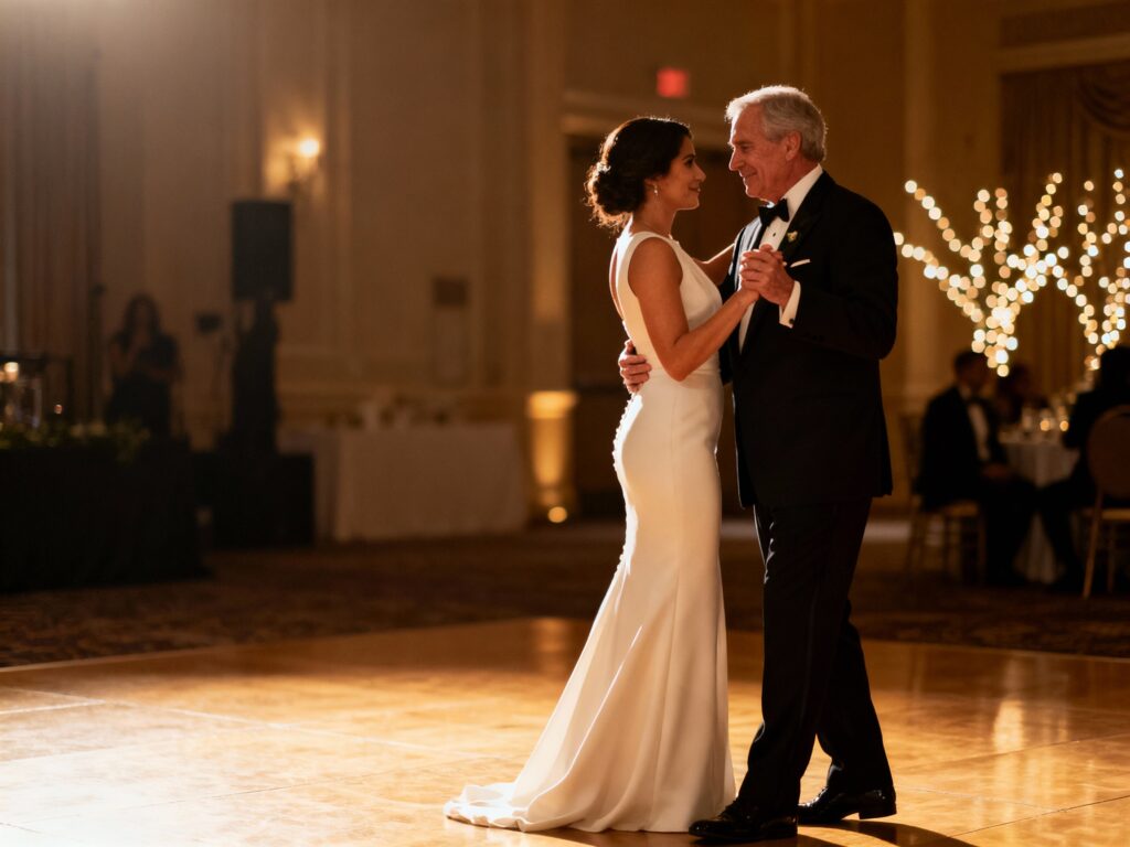 Lighting is everything: ask for warm spotlights or soft amber uplighting during the dance. You can also plan a “photo moment” by having the coordinator cue the photographer at the first hug and again at the chorus. If you want extra magic, invite guests to circle the floor at the last 20 seconds for an intimate, cinematic finish.