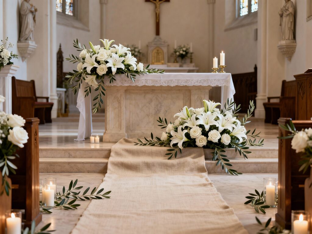 White lilies, roses, and lots of greenery are the easiest “always appropriate” options for churches. They read respectful, photograph beautifully, and align naturally with traditional Christian symbolism like purity, devotion, and new life.