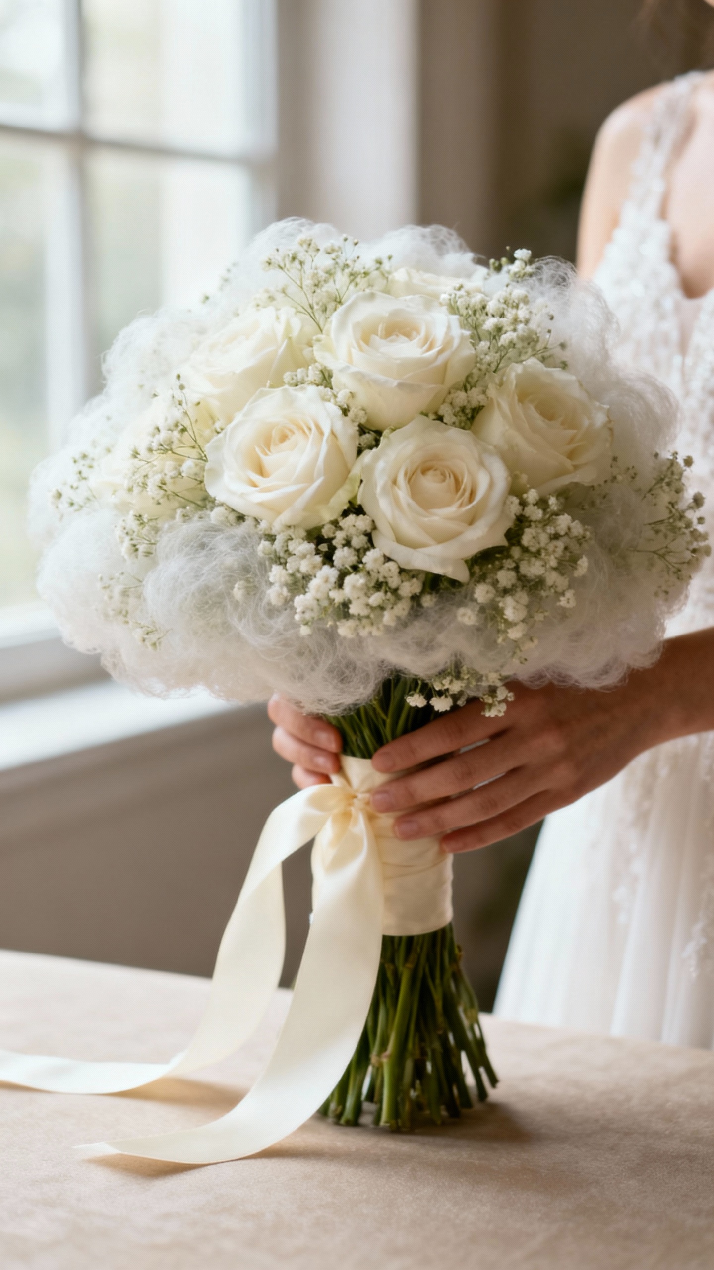 3) White Rose + Baby’s Breath Bouquets (Love + Faithfulness)