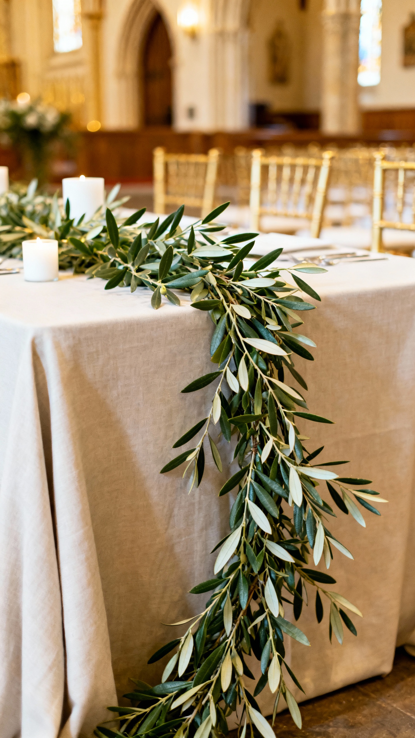 Olive branches symbolize peace and are a beautiful nod to biblical imagery, perfect for couples who want meaning without being too “theme-y.” Drape olive garlands along your welcome table, communion table, or the front of the ceremony platform. They also look stunning on a sweetheart table with taper candles for a modern, Mediterranean feel. Bonus: olive greenery photographs softly and doesn’t overwhelm your floral budget.