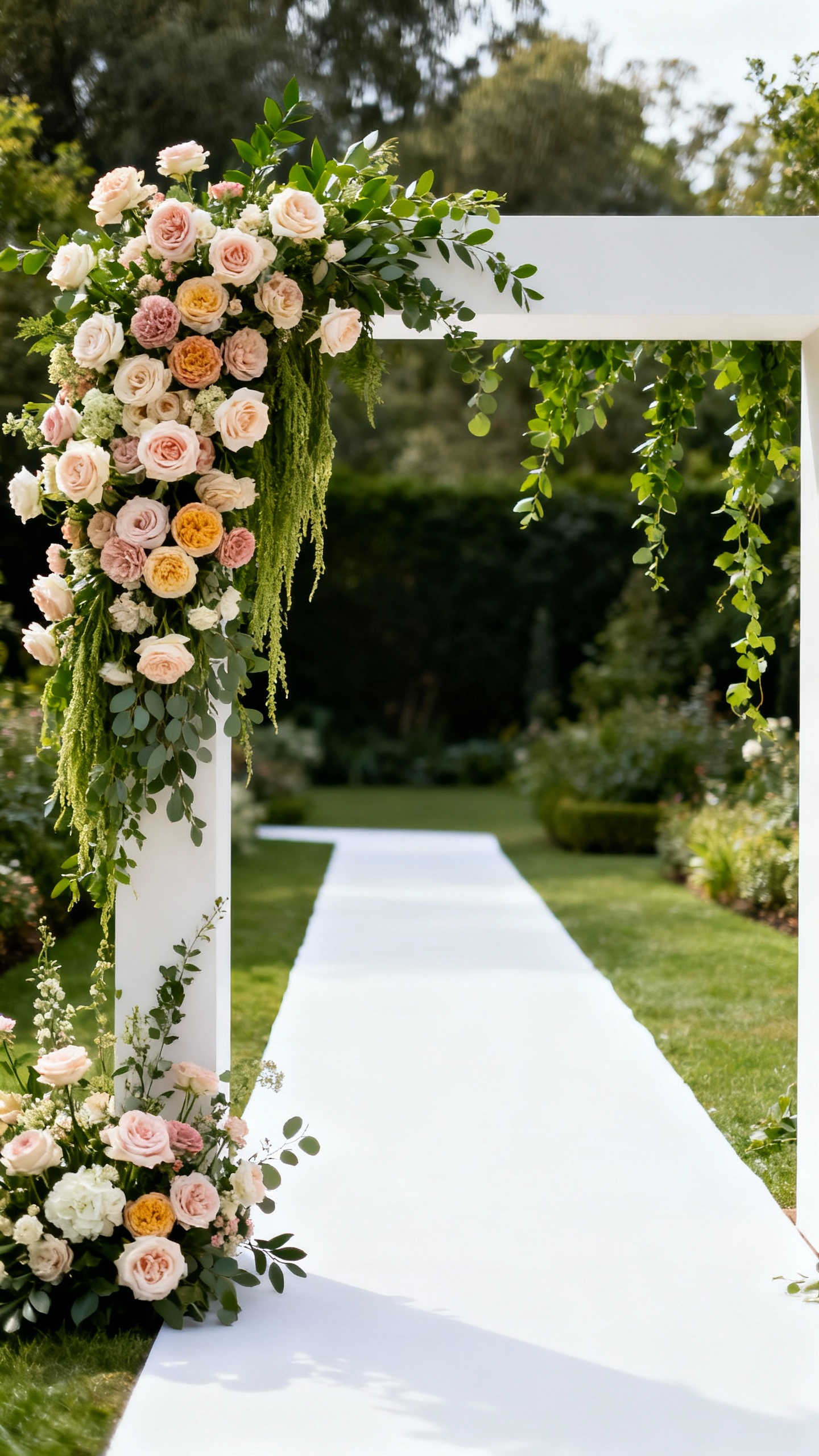A floral arch instantly becomes your “main character” backdrop for vows and photos. For a modern look, go asymmetrical with one lush corner and one lighter side, using greenery to stretch the design. Repurpose it after the ceremony behind the sweetheart table or at the entrance to double the value.